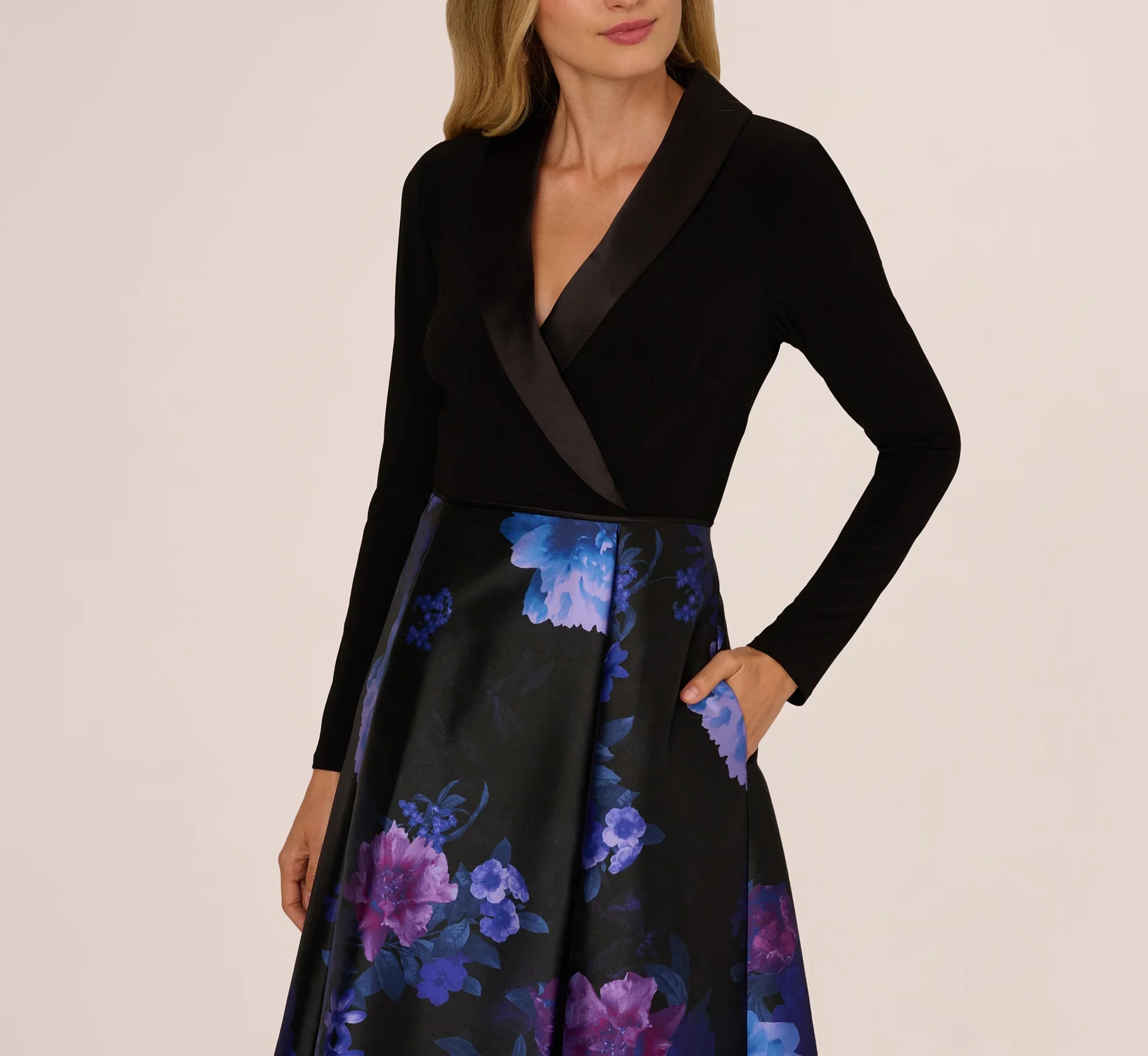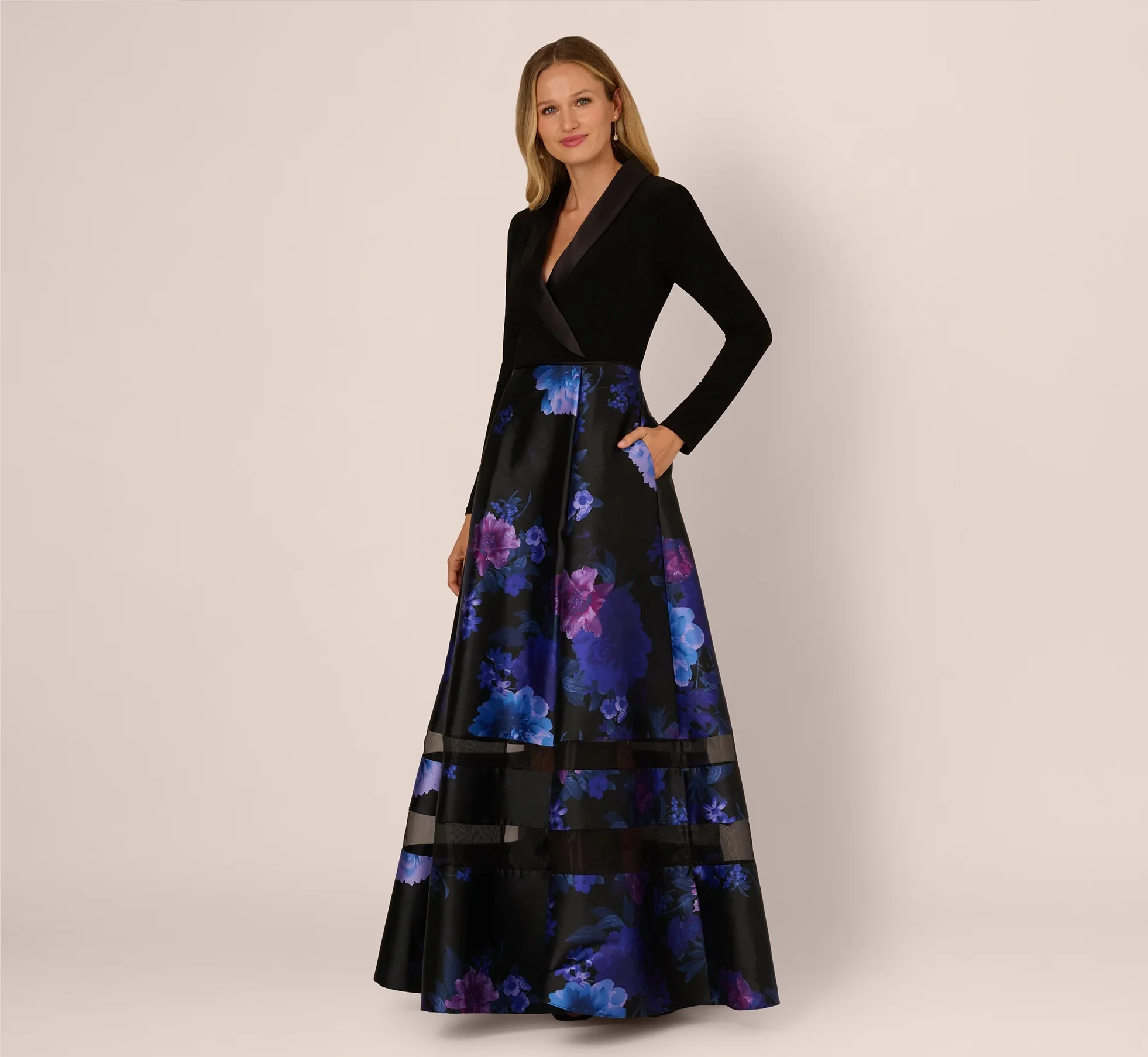 Adrianna Papell Long Sleeve Floral Tuxedo Combo Ballgown