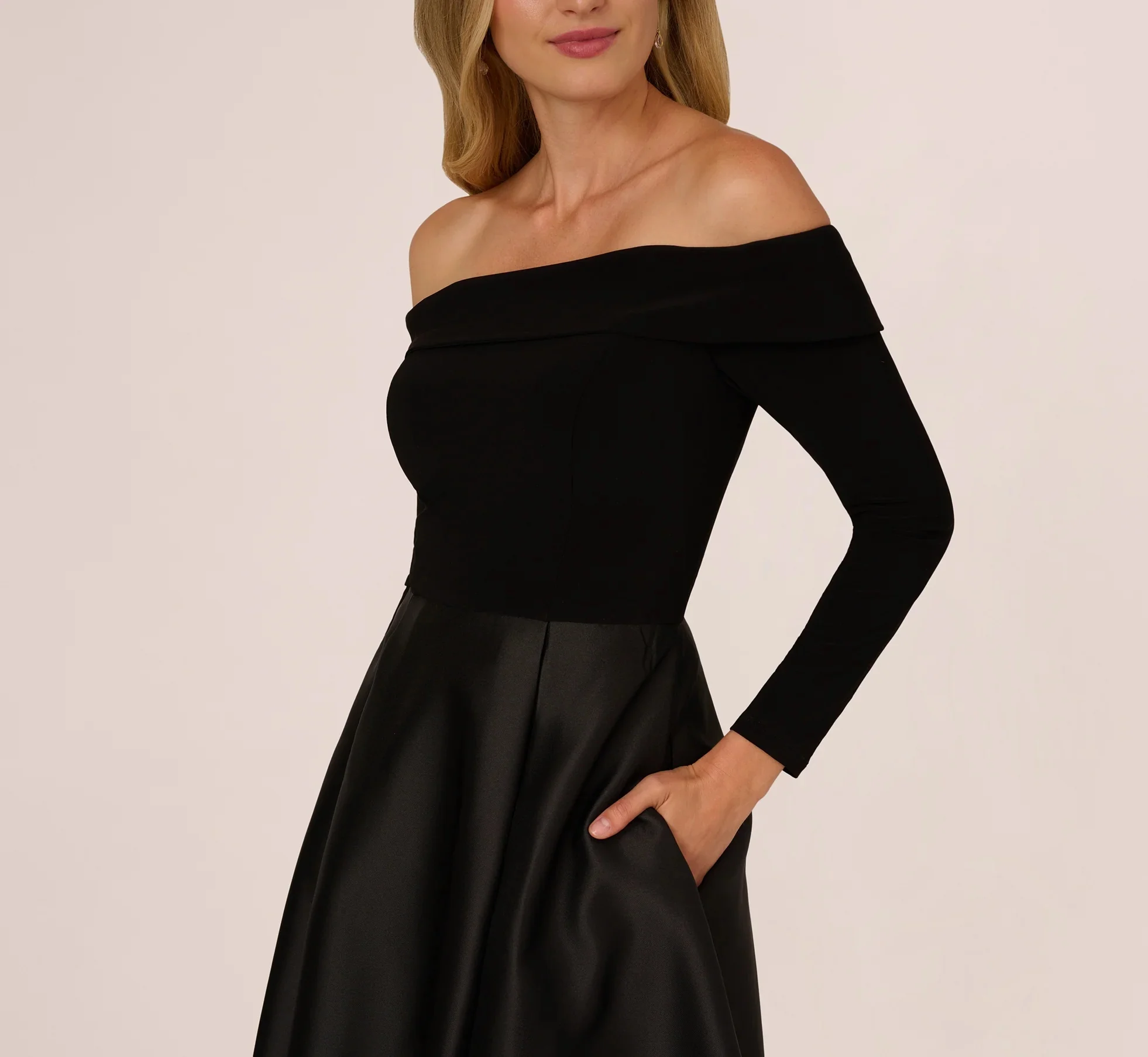This elegant gown combines comfort and sophistication with a long sleeve stretch jersey bodice and a graceful off the shoulder neckline. The ankle length skirt, cut from lustrous Mikado fabric, features soft pleating for added volume and movement. Side pockets lend a touch of modern convenience to the classic A line silhouette. Ideal for formal evenings and weddings, this dress matches timeless polish with practical details for a look that’s as effortless as it is refined.