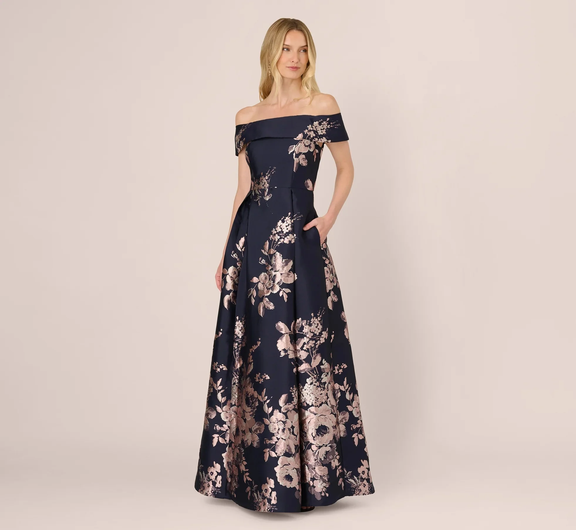 A modern classic with timeless appeal, this striking gown features a fit and flare silhouette, tailored with princess seams through the bodice and a full, pleated skirt for graceful movement. The rich metallic jacquard is woven with a bold floral motif that catches the light with every step. Framed by a foldover off the shoulder neckline, this polished look is finished with convenient side pockets. Turn heads at your next formal event or big celebration in this glamorous evening dress.