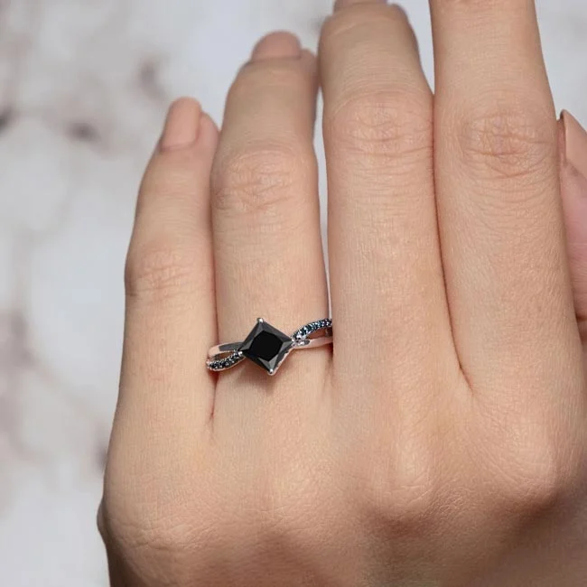 This princess cut black diamond twist engagement ring features open curving shoulders adorned with shared-prong set black diamonds sweeping up to the kite-set black diamond center.