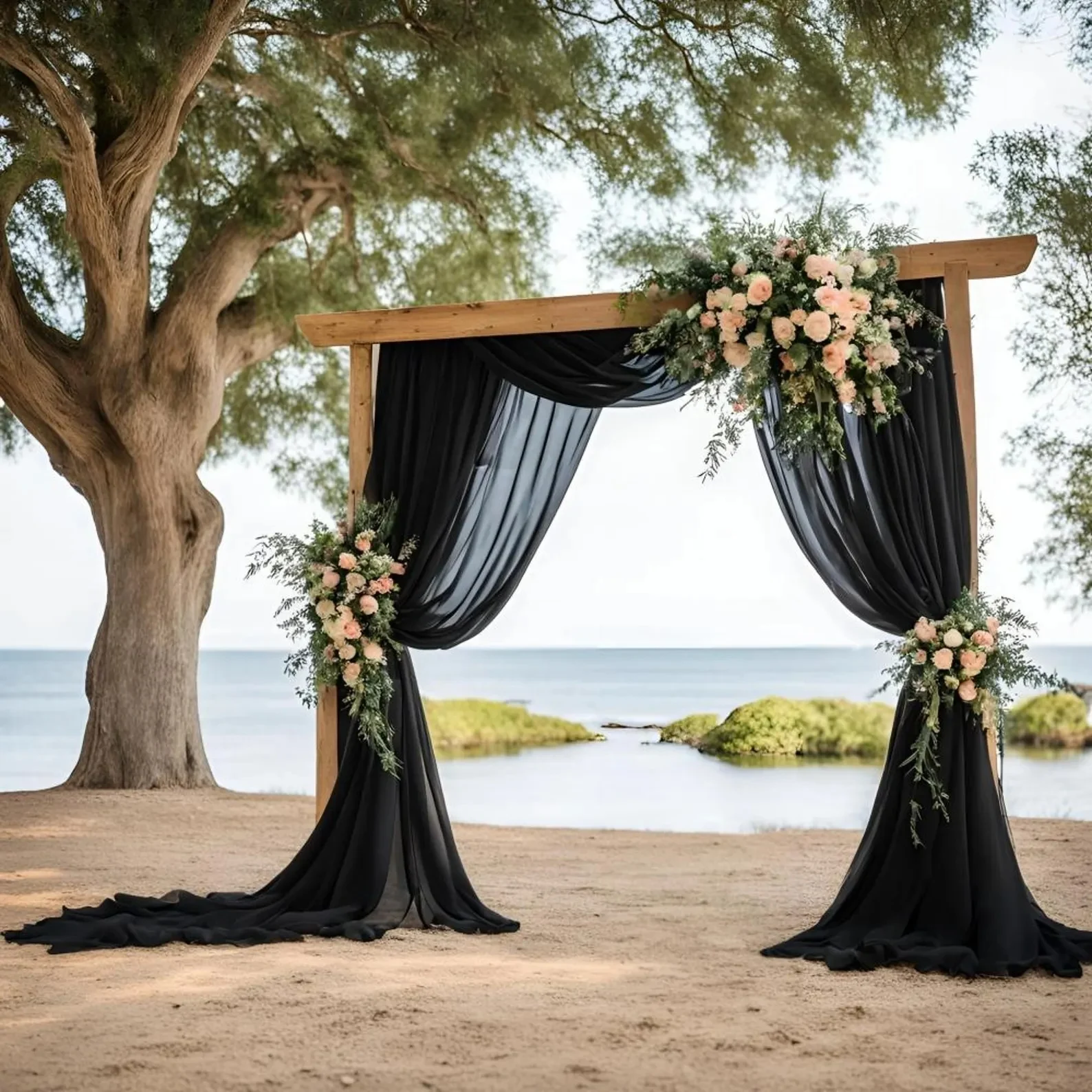 Transform your wedding venue with our breathtaking Black Chiffon Wedding Arch Curtain, designed to add a touch of elegance and romance to any setting. Perfect for creating stunning wedding arches, this drape offers both beauty and functionality. With a drop of 4 meters and a width of 3 meters, this drape provides ample coverage for various setups, ensuring a seamless and luxurious appearance.