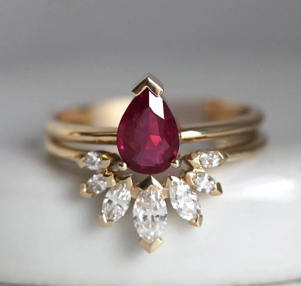 Capuccine Korina Natural Pear Ruby Engagement Set With Diamond Crown