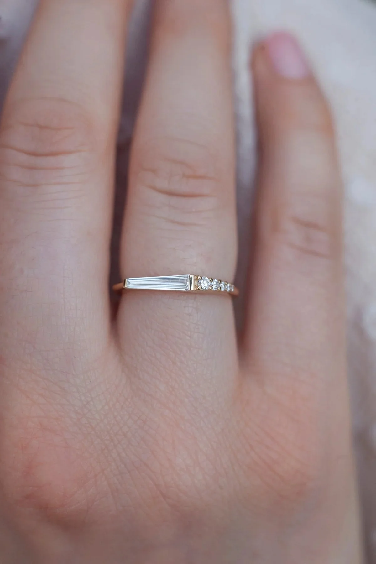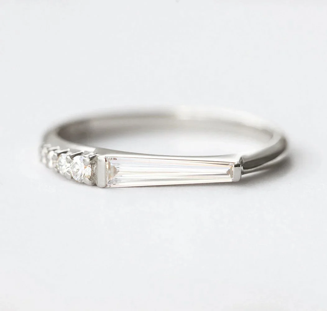 The sleek and modern tapered baguette-shaped diamond ring features a gorgeous, sparkly, natural baguette diamond. The ring can act as a wedding band or a standalone ring. Inspired by the Art Deco era with a modern twist.