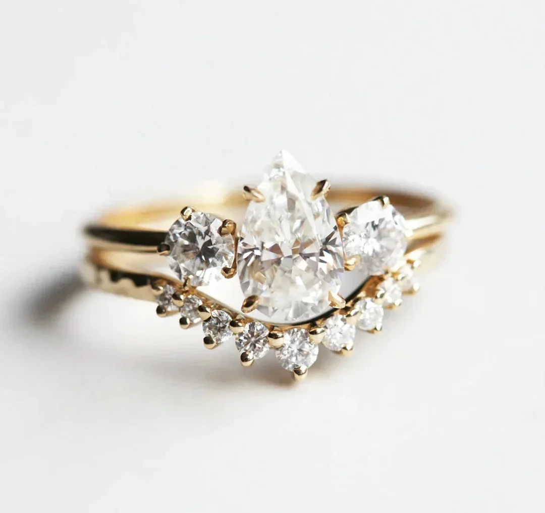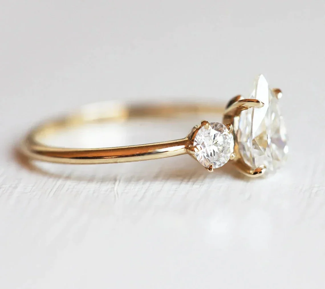 Timeless. Eye-catching. Elegant. This simple design features a brilliant-cut pear-shaped moissanite and two additional round moissanites for extra sparkle in a simple polished yellow gold band. Also available with a matching wedding band.