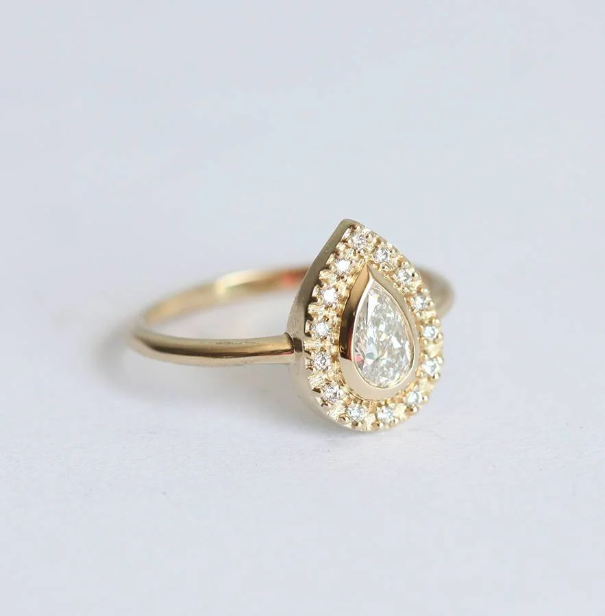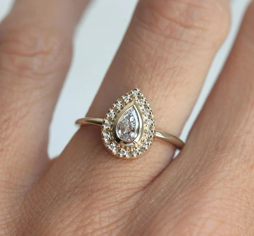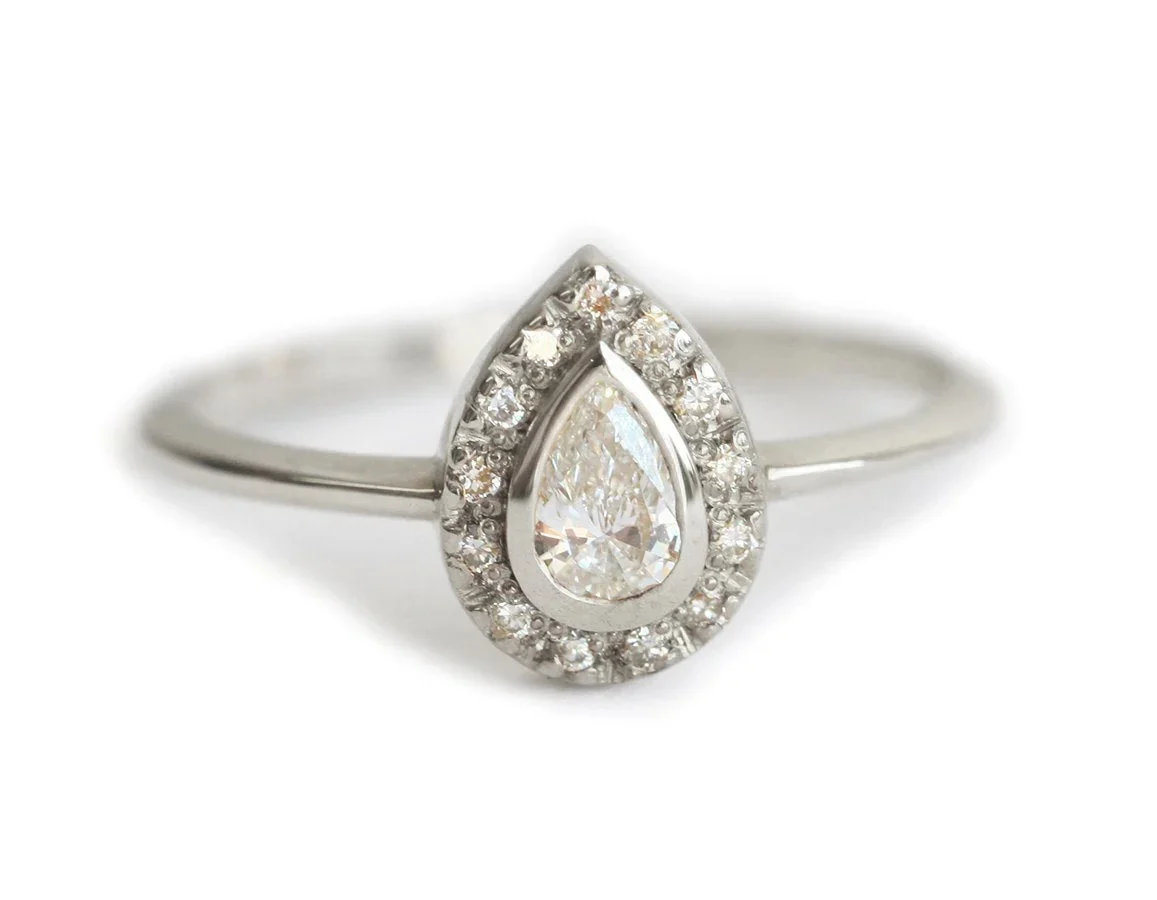 Top your proposal with Andie, a gorgeous and delicate pear Diamond ring with sparkly halo set Diamonds. With a refined finish and a sophisticated design, this piece of jewellery will certainly embellish a lady’s hand.