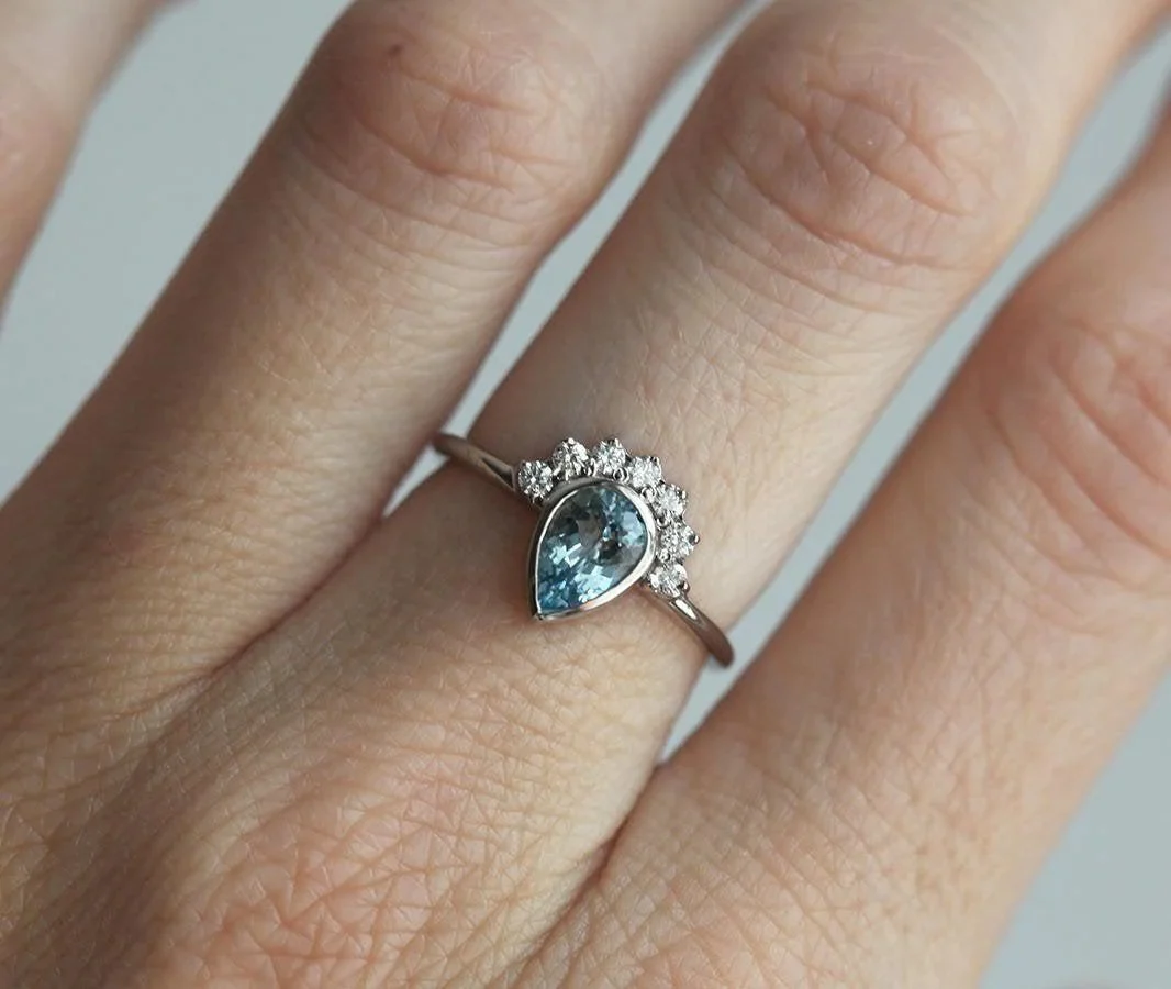 This pear-cut Aquamarine and Diamond crown ring is the perfect engagement or wedding ring, thanks to its sophisticated, beautiful design. The design can be made with gemstones of your choosing.