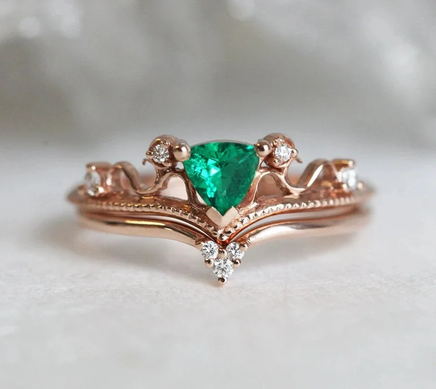 A sparkly vintage genuine emerald and diamond standalone ring or matching set made in 14k or 18k gold, pictured in rose gold. The design can be made with gemstones of your choosing.