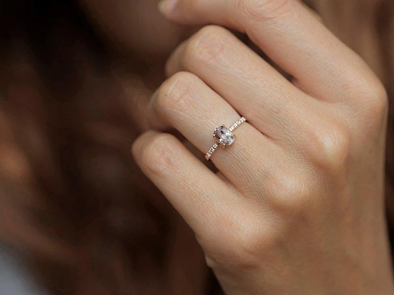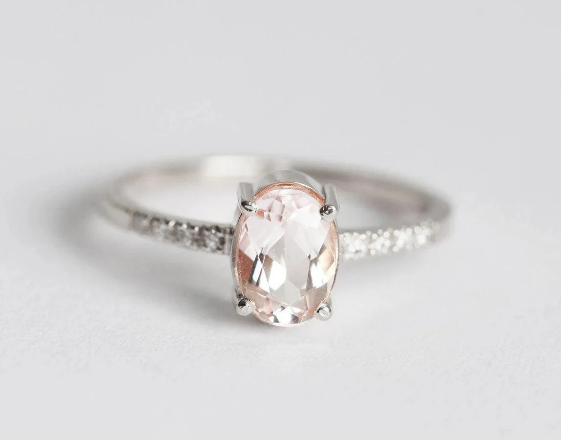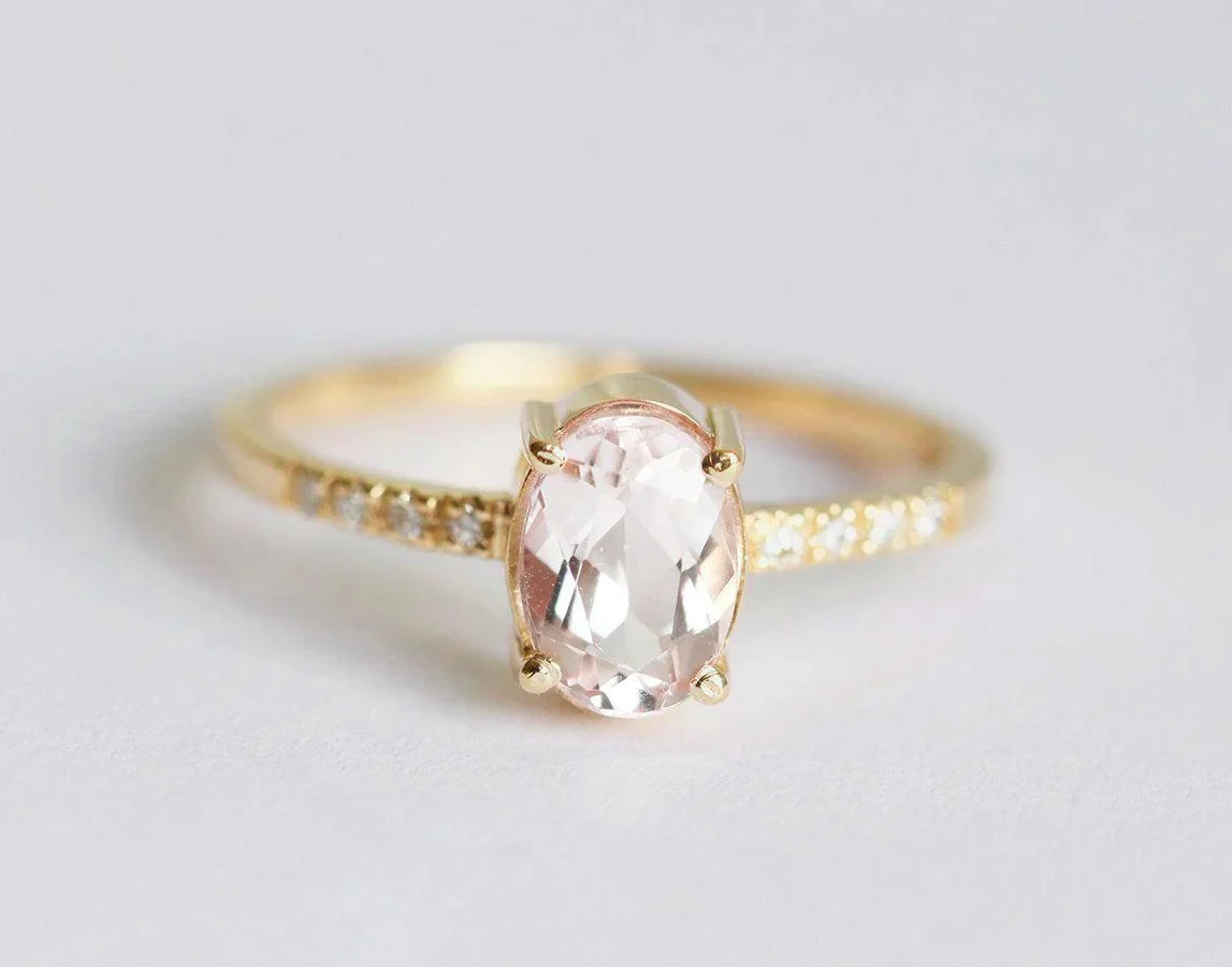Feminine and elegant oval morganite and diamond engagement or wedding ring with a half eternity band in rose gold. Due to its sophisticated finish, this ring is sure to exalt a lady’s beauty.