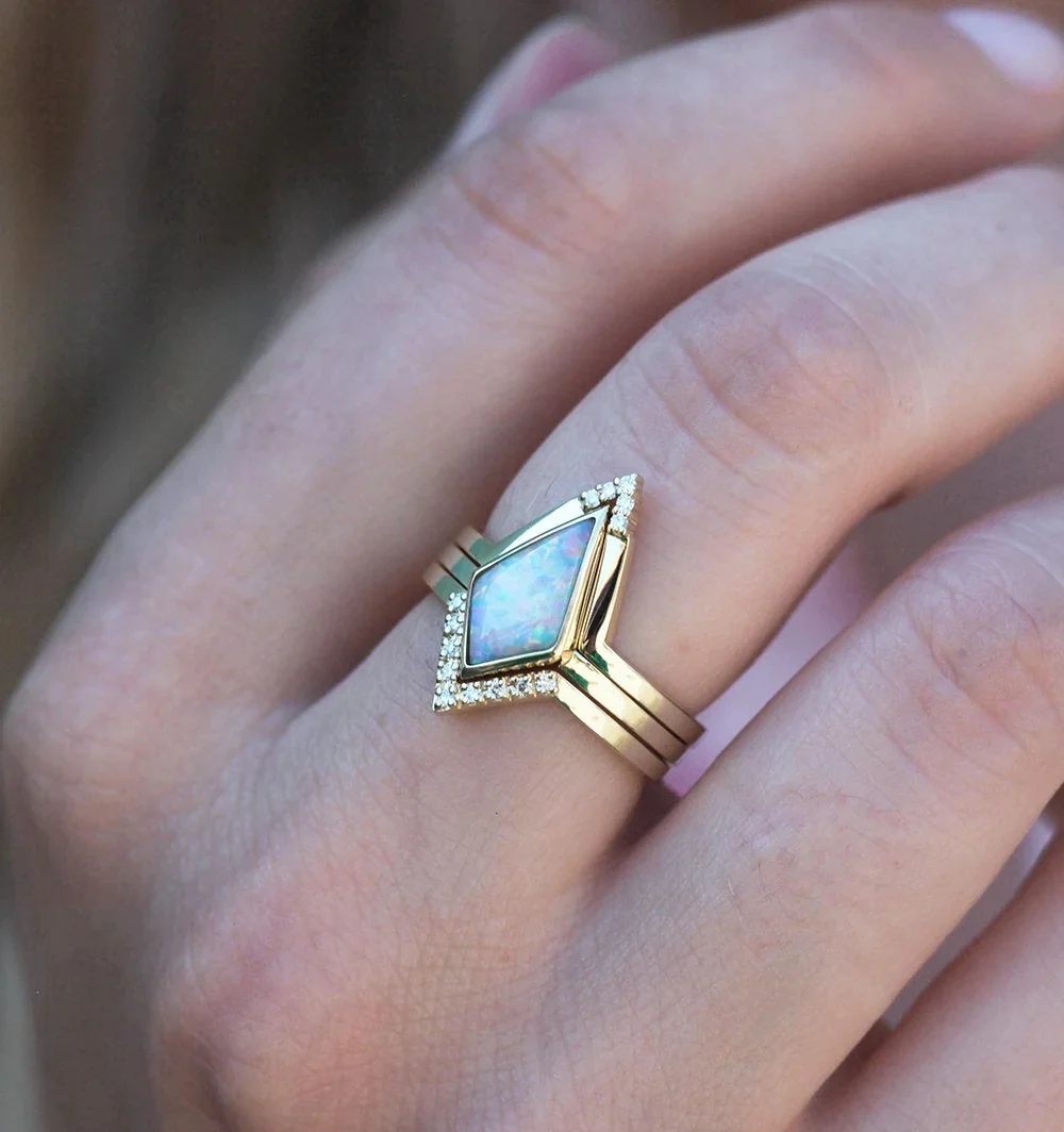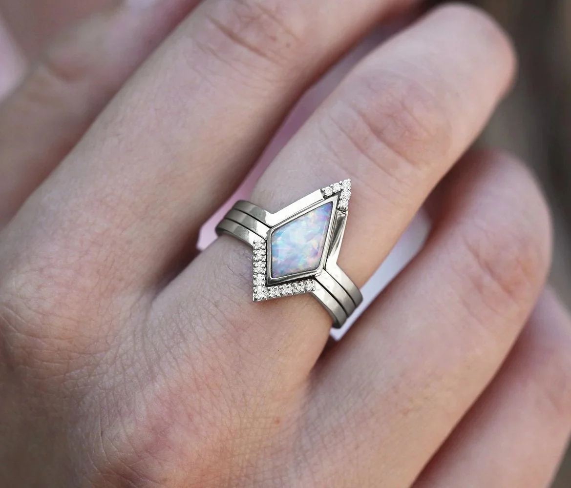 Harriet, a unique kite Australian Opal and Diamond engagement or statement ring set that will make your special day unforgettable.