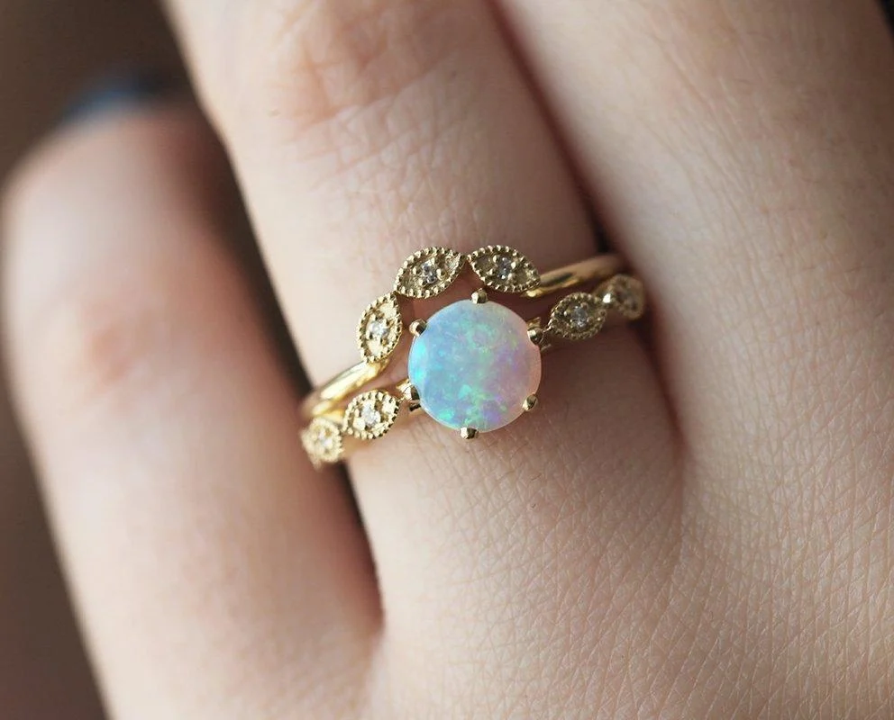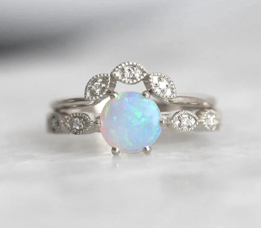 Breathtaking and vintage round-cut Australian Opal ring that will make your special day unforgettable. With a traditional Diamond pave band and a sophisticated centerpiece, this ring is sure to make your lover fall in love all over again.