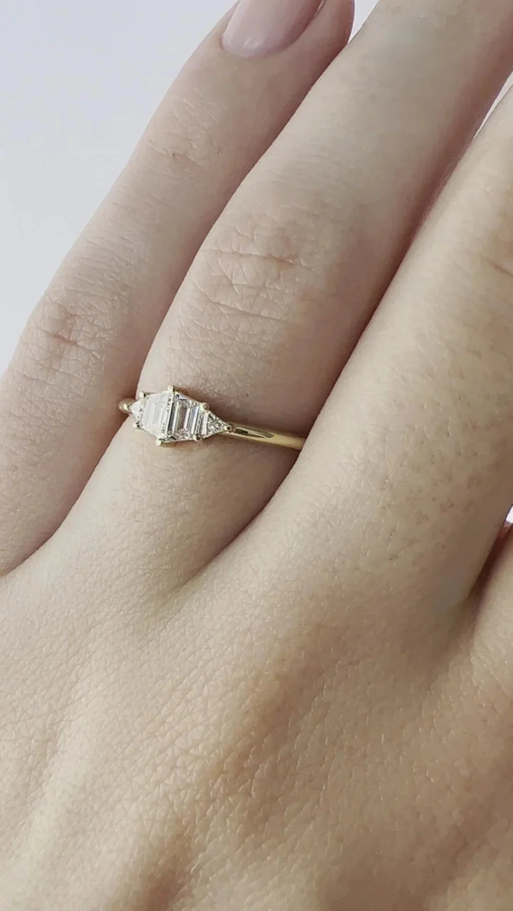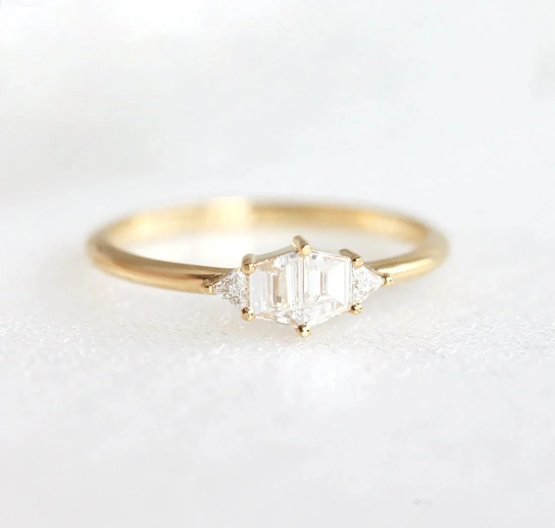 This ring showcases the quality and elegance Capucinne provide. Its White Diamonds with trapezoid and triangle shapes are arrayed in a delicate and feminine manner and are made to refract the light effortlessly. Its smooth looks make it the perfect choice for an engagement or wedding ring.