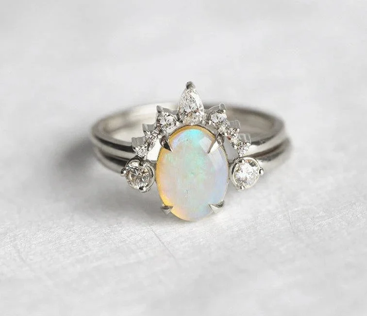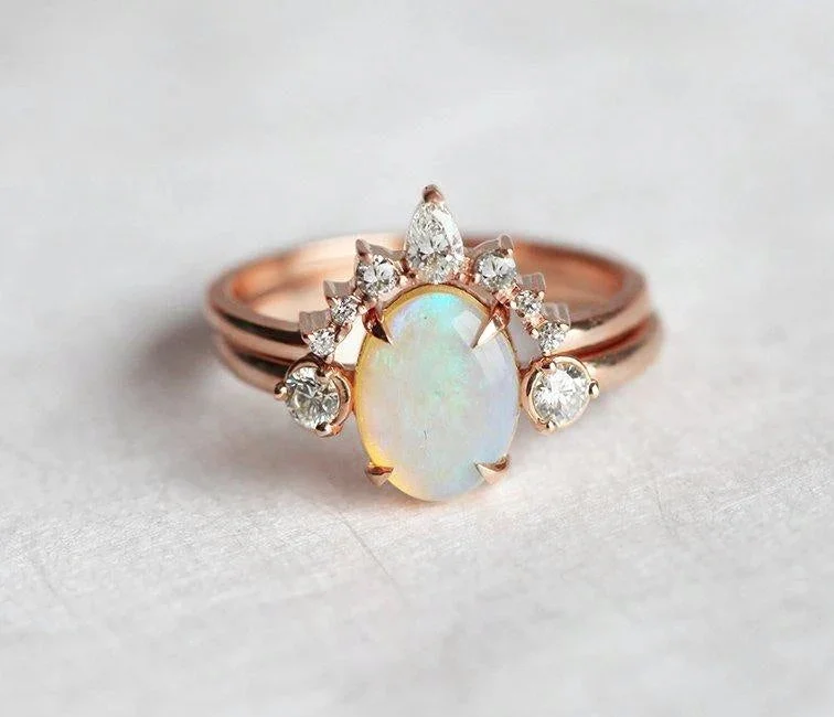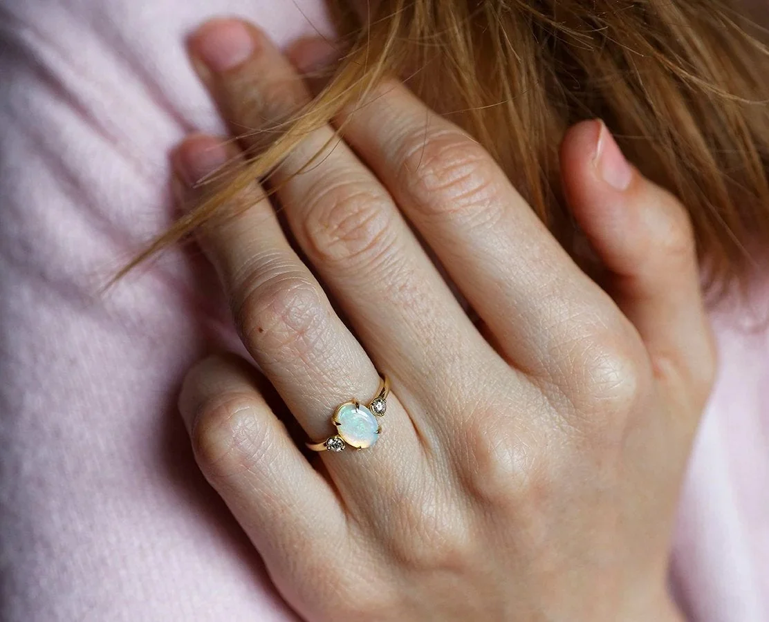 Karla, a beautiful oval-cut Opal ring with two Diamonds on the sides, meant to hold romantic memories within.