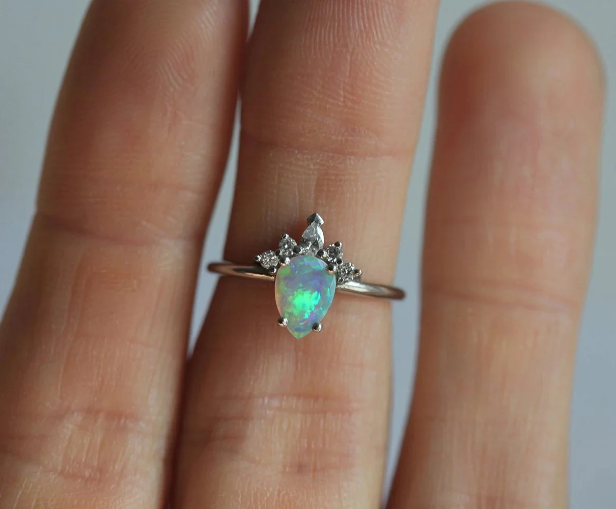 Kimora, is a stunning way of celebrating your love. Showcasing a breathtaking pear-cut Opal as a centerpiece and a Diamond crown, this piece is sure to exalt your lover’s beauty as it lies on her finger.