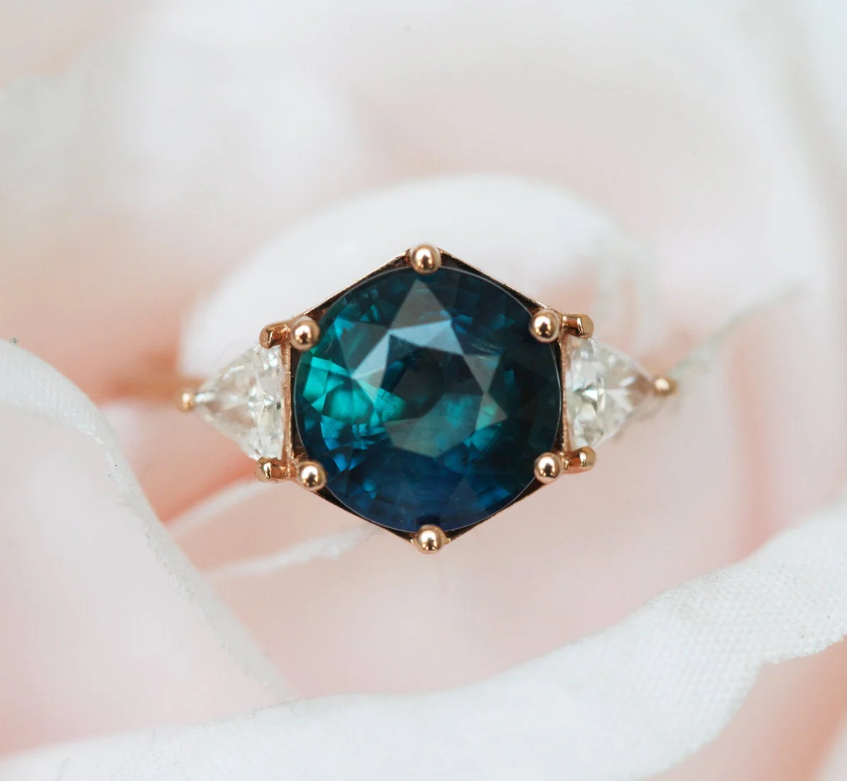 Looking for something special to celebrate a special occasion, like an anniversary or birthday? Look no further —Capucinne’s insanely beautiful 2.1ct round teal sapphire with side-diamond ring, Marlow, will most definitely be the surprise she deserves!