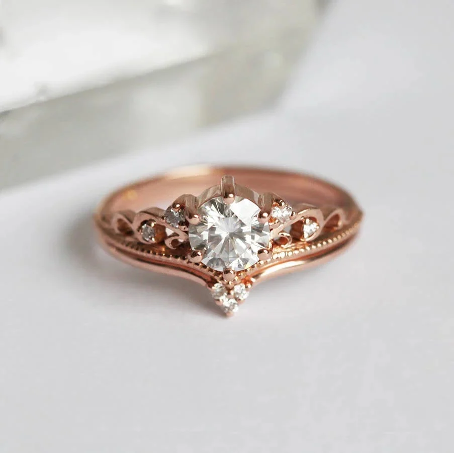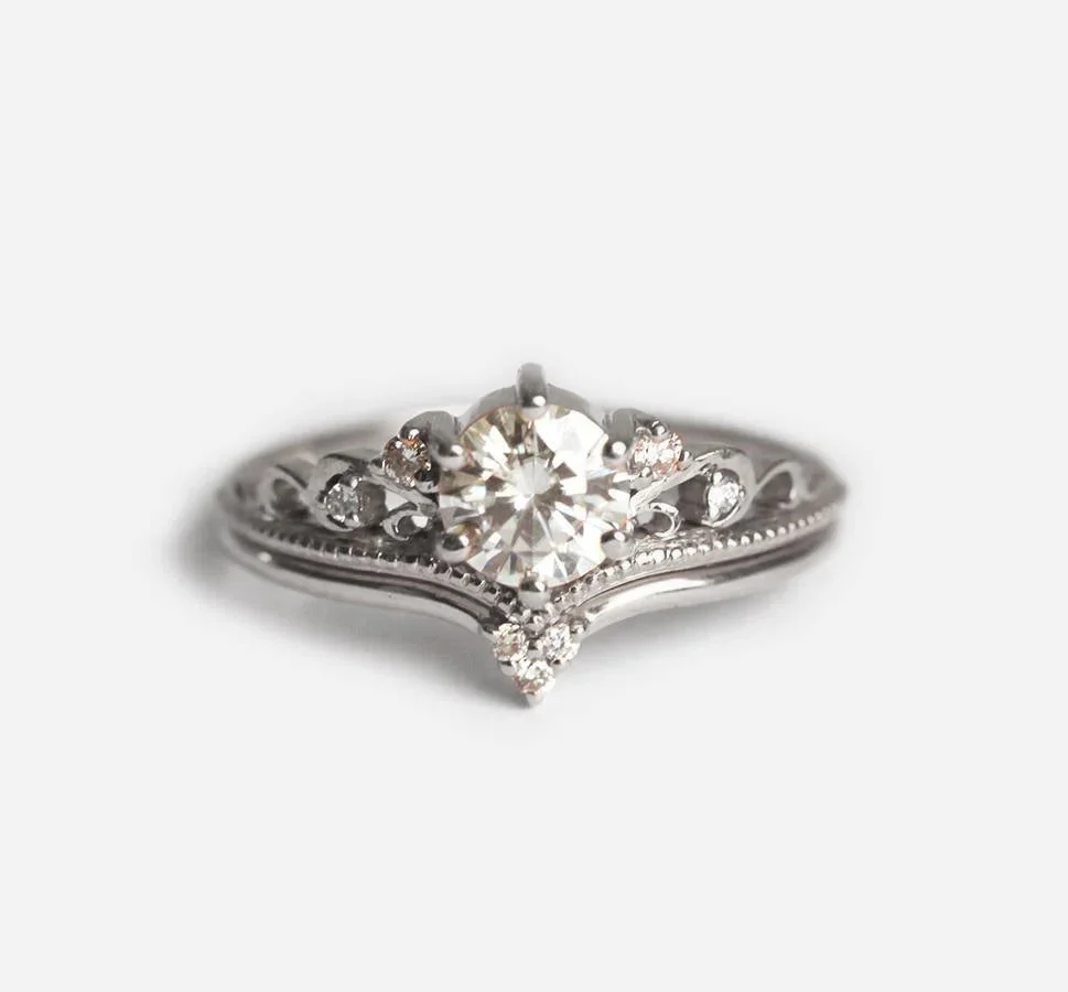 A vintage inspired moissanite and diamond engagement ring set with a 5mm round moissanite, accent white diamonds, milgrain and milgrain detailing. Other stones are also available.