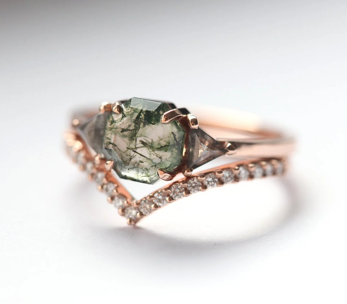 Capucinne Octagon Moss Agate & Salt Pepper Diamond Ring