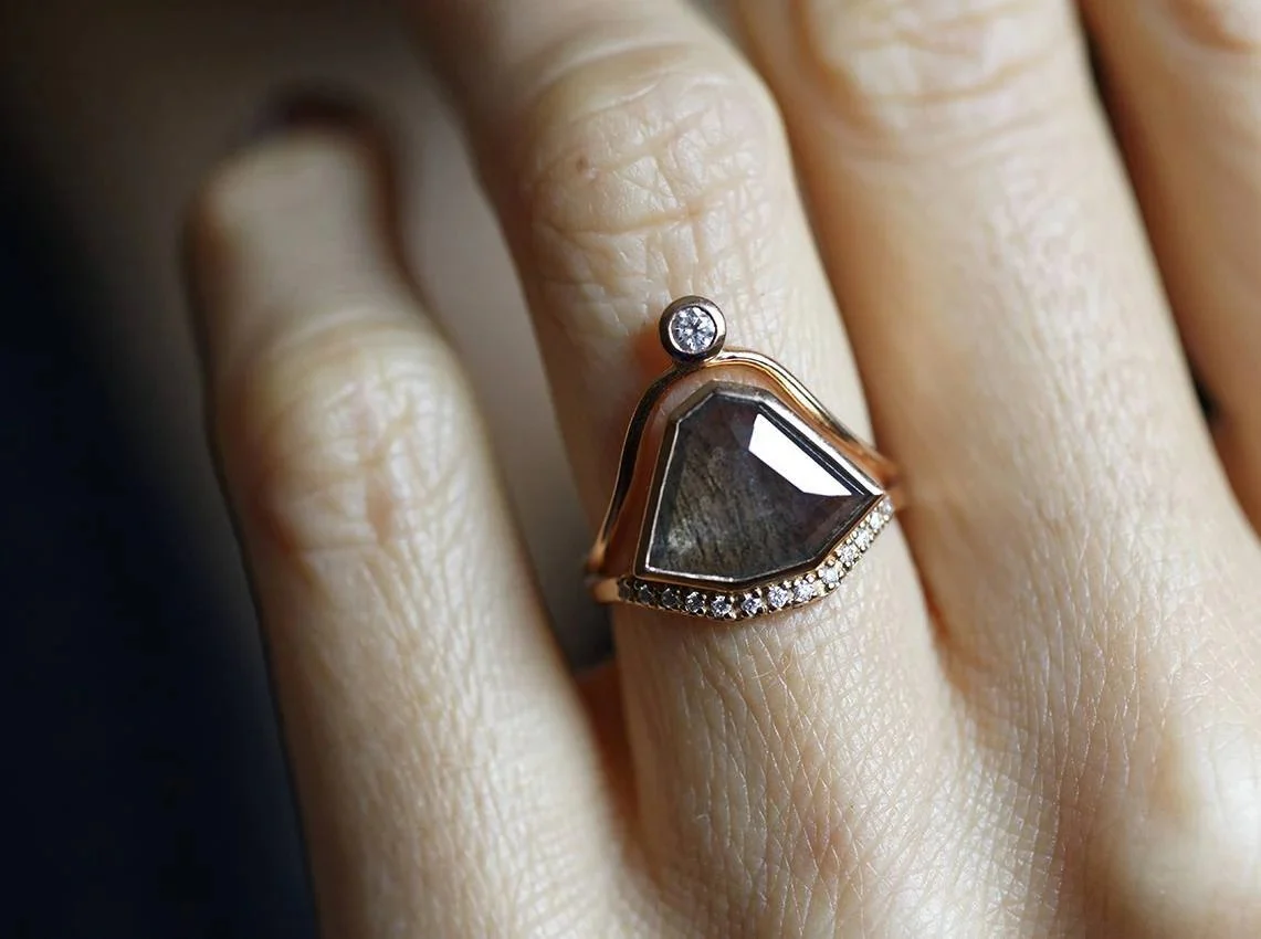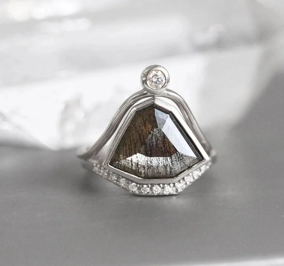 The Paige ring set is a unique modern engagement ring set with a one-of-a-kind grey diamond, complemented by white diamonds. In a very organic and geometric shape, this ring set makes it a perfect engagement ring with an accompanying wedding band, creating an ultimate one-of-a-kind statement piece.