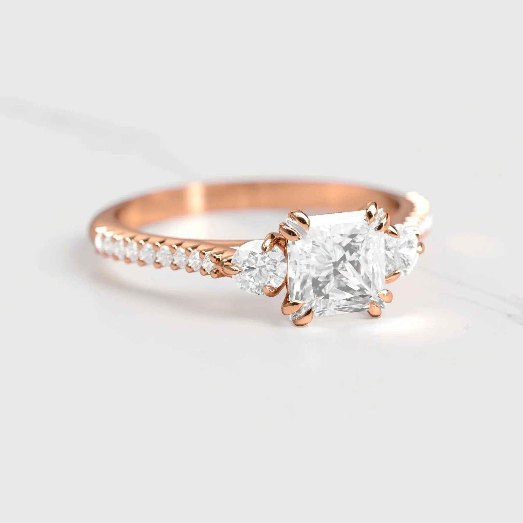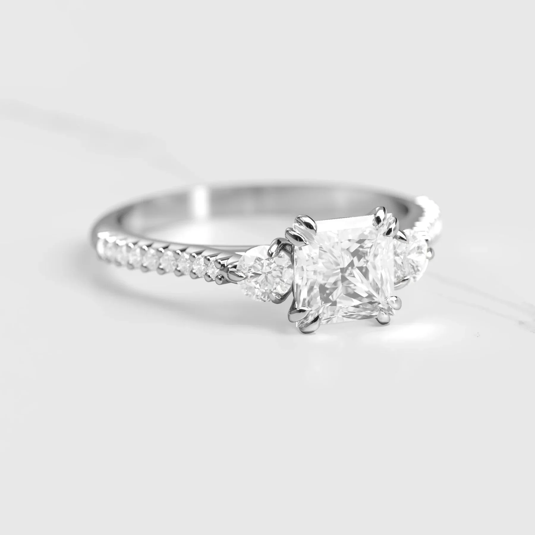 This timeless setting comes with two smaller round shaped diamonds on each side and a pave band that will compliment the brilliance of the stone in a breathtaking way.