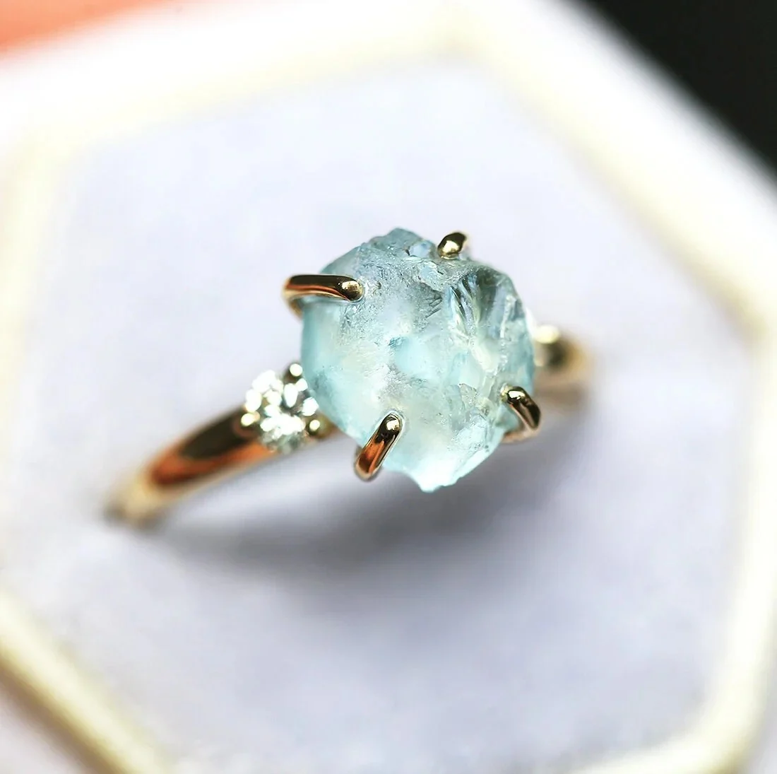 Simply beautiful. The use of the Raw gemstone is emphasised by the diamonds on the sides, creating a down-to-earth piece that can impress whoever sees it.