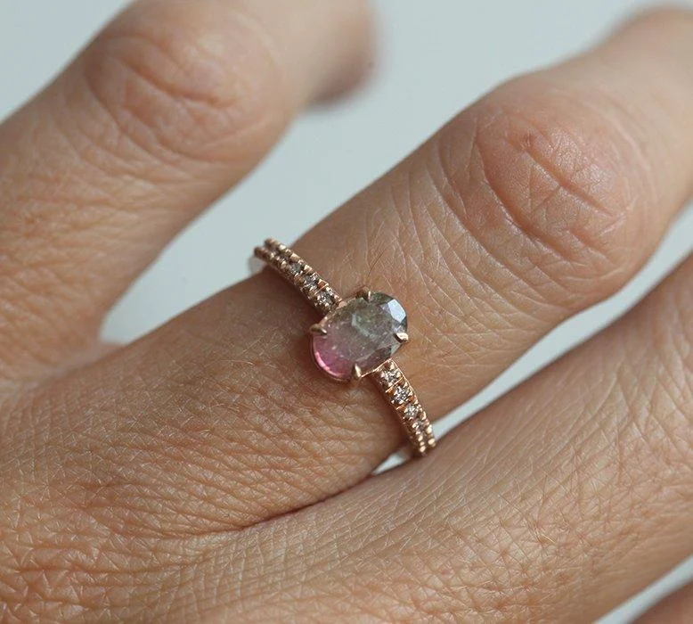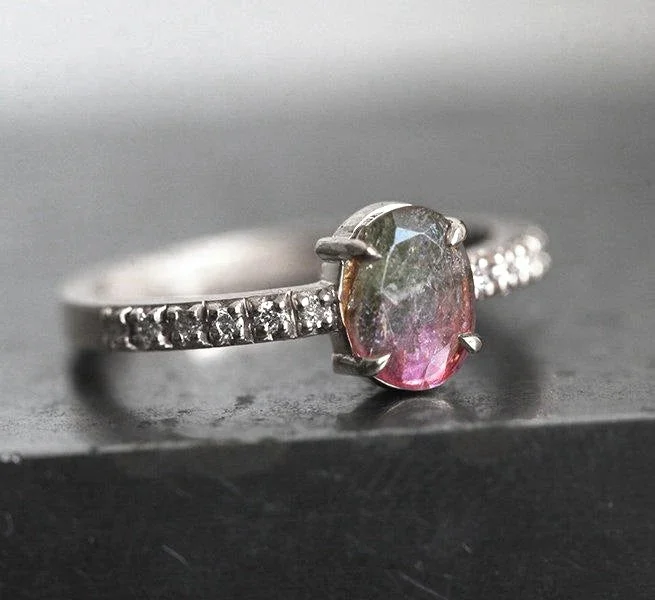 One of a kind, this oval-cut watermelon Tourmaline ring will have people complimenting it repeatedly. Showcasing a Diamond pave band, brilliance and uniqueness are ensured.