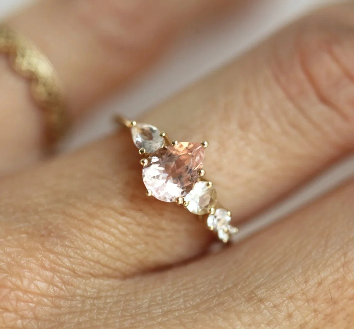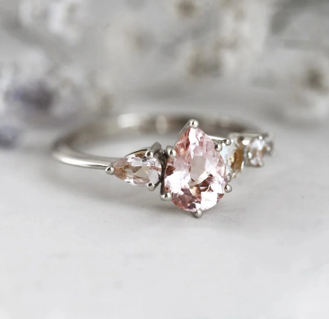 Modern and sophisticated, Zendaya is a beautiful option to celebrate your engagement or wedding day. Displaying an asymmetrical array of Sapphires complimenting a pear-cut Morganite, it is sure to say this piece will elevate your lover’s looks with style and elegance.