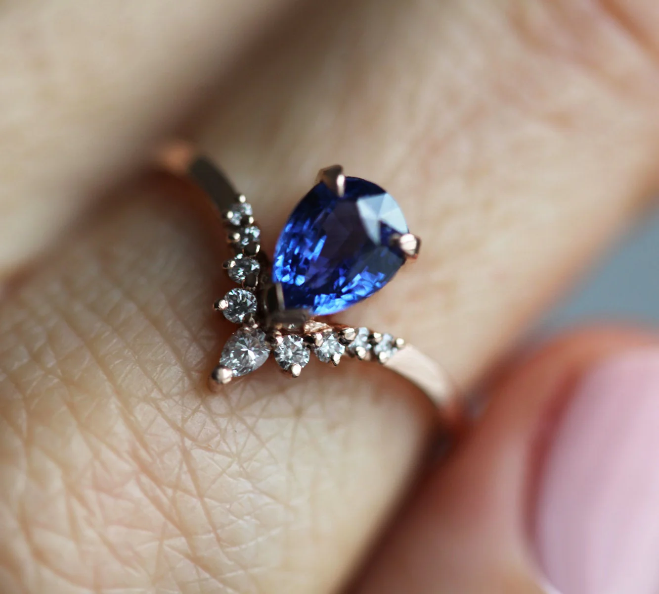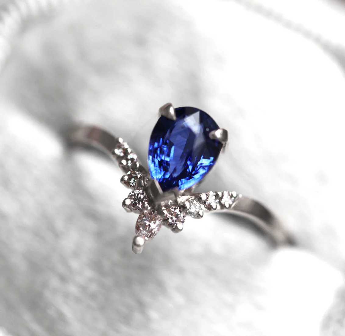 Fit for a queen, this pear cut royal blue Sapphire in an exquisite design with Diamonds is the perfect companion while stepping into a new era in your life. The chicest engagement ring.