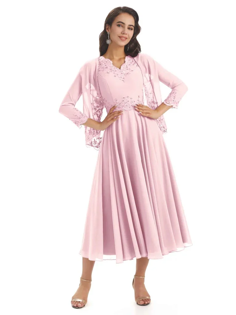 Chicsew Elegant A-line Chiffon V-neck Tea-length Two Piece Dress