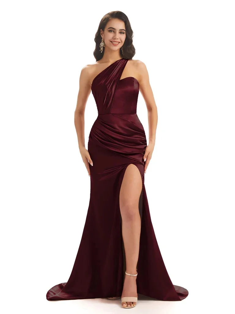 Chicsew Soft Satin Side Slit One Shoulder Long Maxi Mermaid Bridesmaid Dress