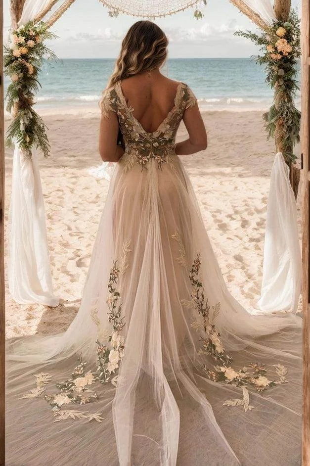 Cocomelody A-Line Court Train Lace Tulle Wedding Dress