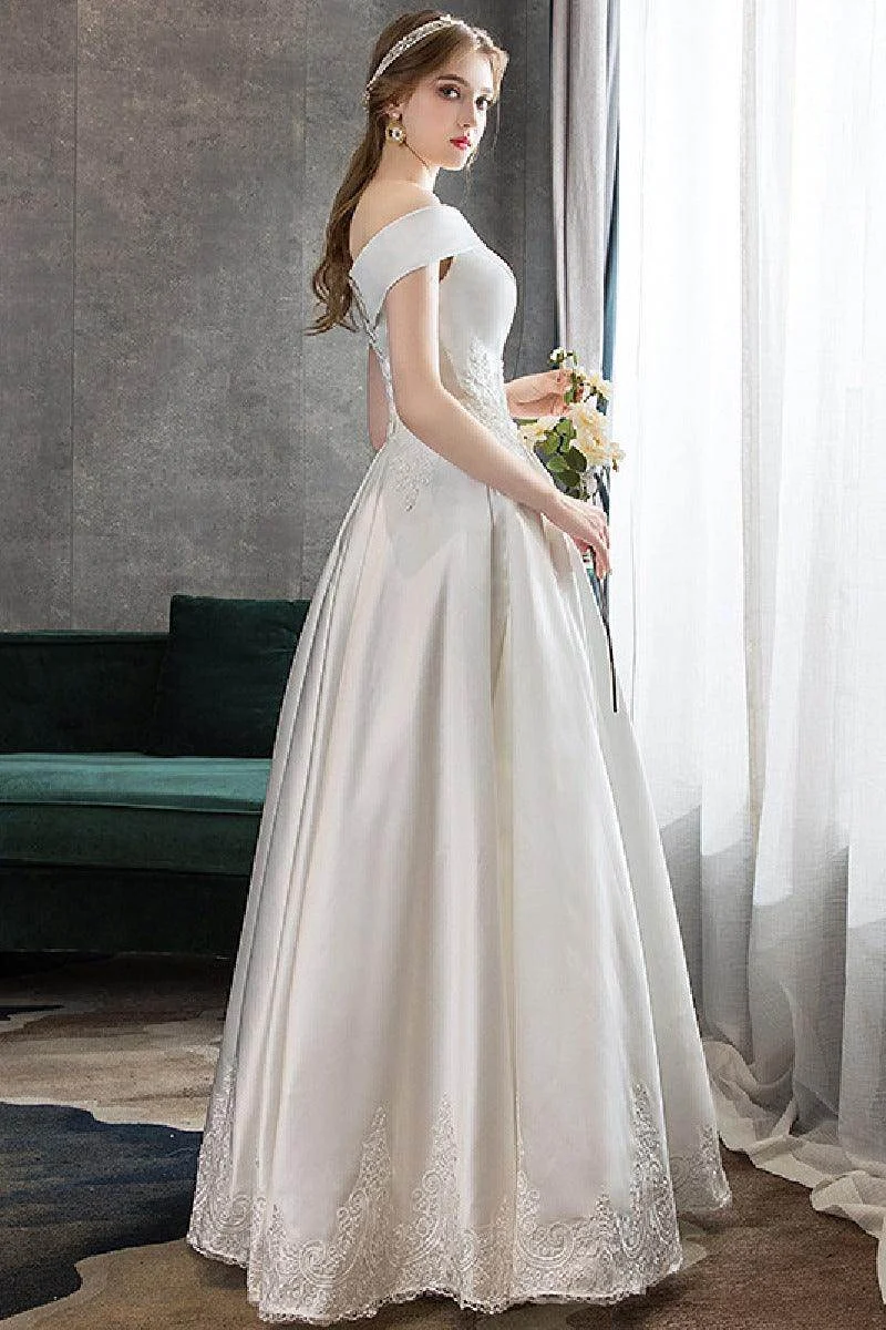 This stunning A-line floor-length satin wedding dress with off-the-shoulder sleeves and lace-up corset is perfect for a timeless wedding.