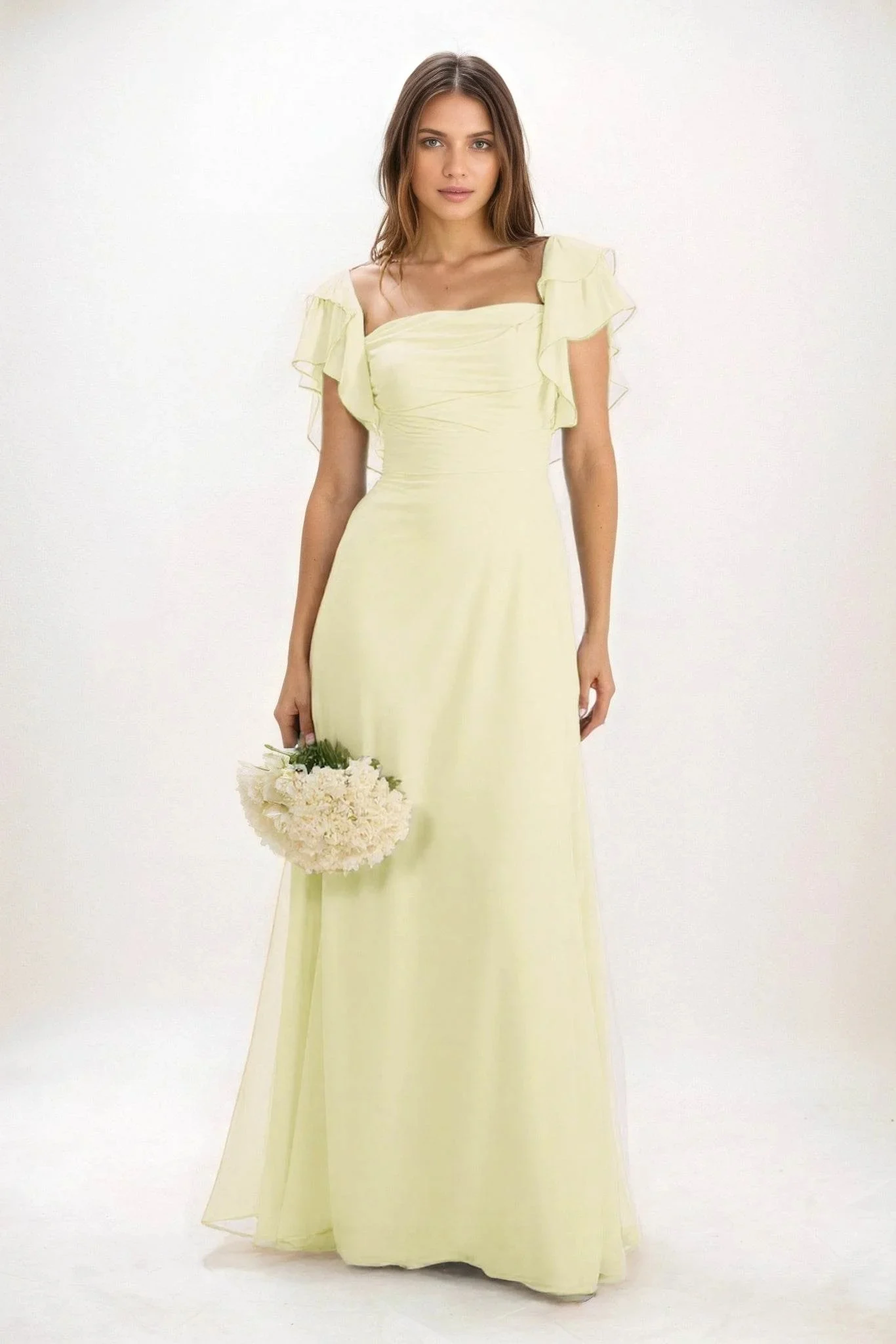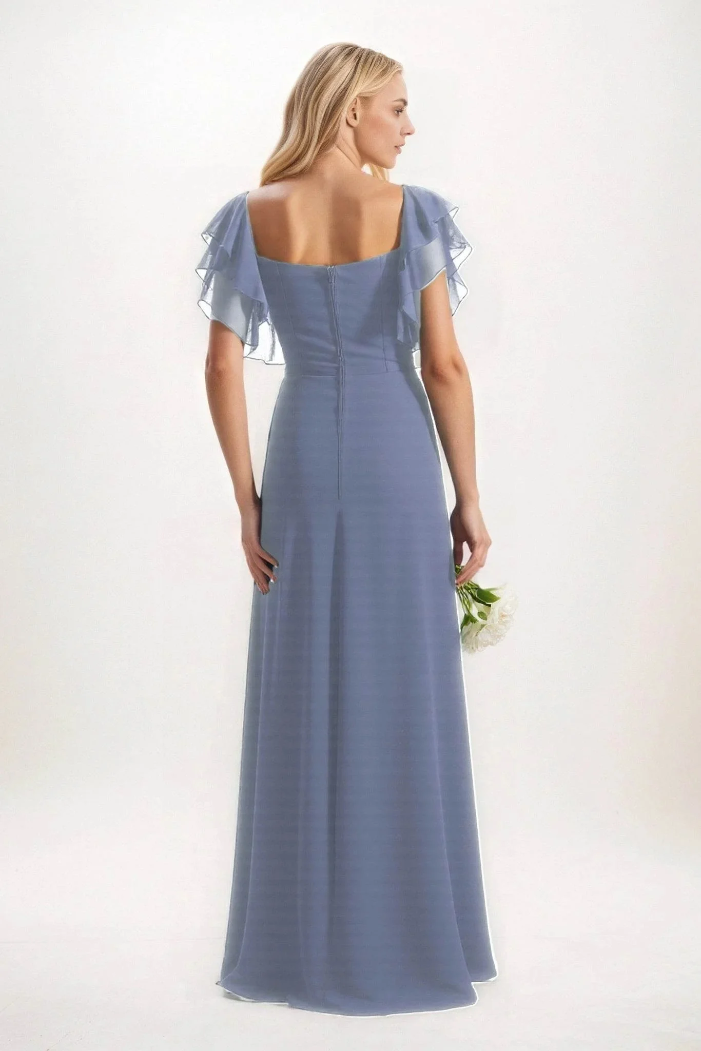 This elegant A-Line Maxi Chiffon Bridesmaid Dress features a bateau neckline and ruffle sleeves, perfect for a stylish and comfortable bridal party look.