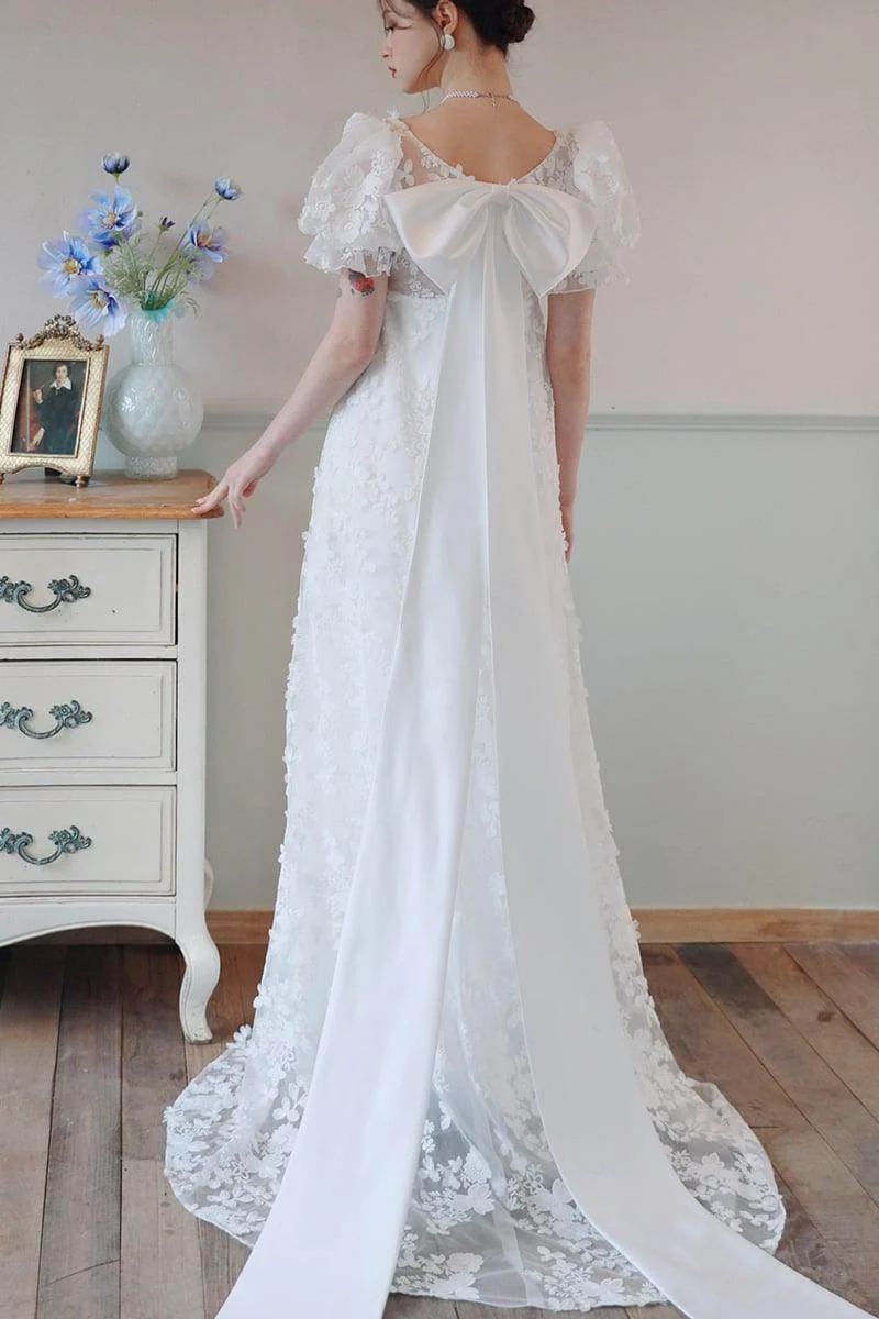 Cocomelody A-Line Sweep-Brush Train Lace Satin Wedding Dress