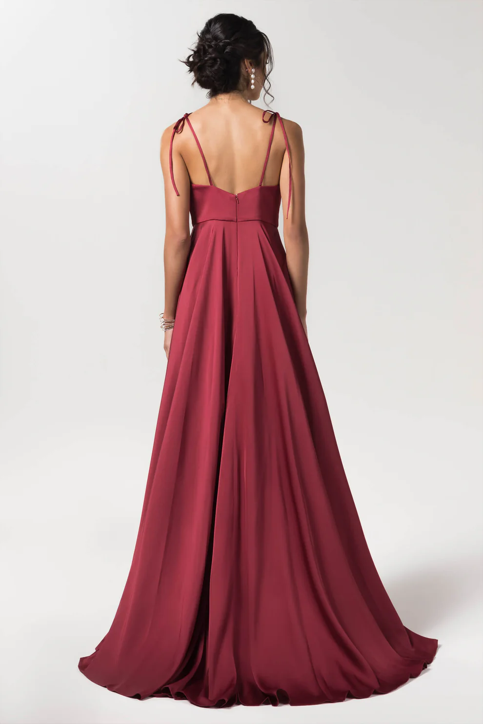 A-line sweep-brush train luxe satin bridesmaid dress. This lovely dress features spaghetti straps, a split, and a sweep-brush train. The A-line silhouette is perfect for any bridesmaid!