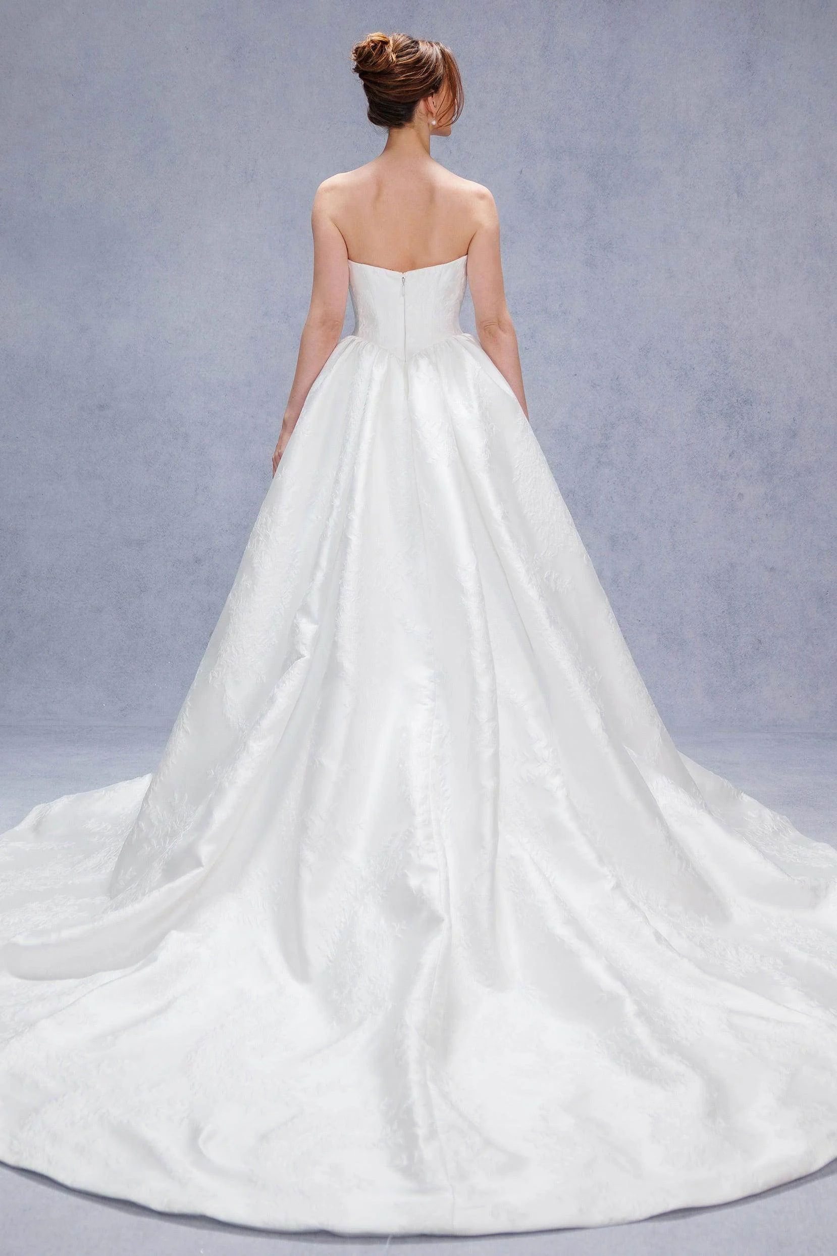 This ball gown wedding dress in jacquard satin features a stunning floral pattern, adding a graceful touch to the classic design. The full skirt flows into a court train, creating a dramatic yet refined silhouette. A perfect choice for a bride who desires a blend of vintage charm and romantic elegance.