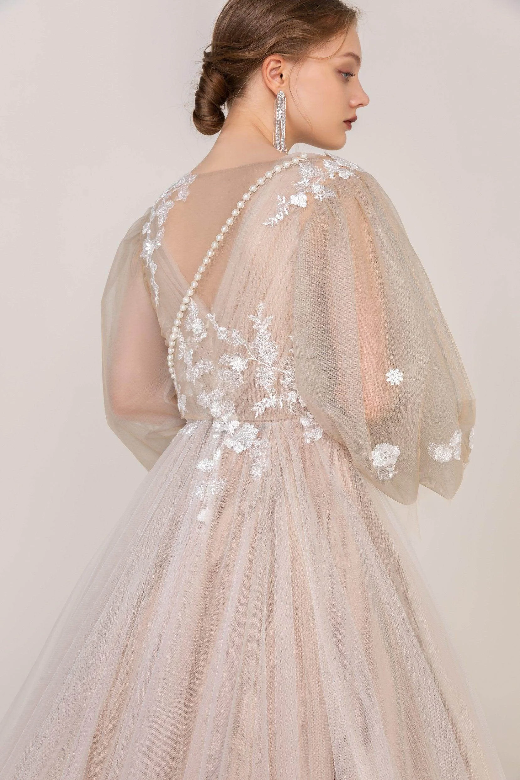 Introducing the “Carolina” wedding dress—an elegant A-line gown with delicate appliques and a graceful V-neck. Its long sleeves and court train add timeless charm. Perfect for hotel, church, garden, or hall weddings, this stunning dress exudes effortless sophistication.
