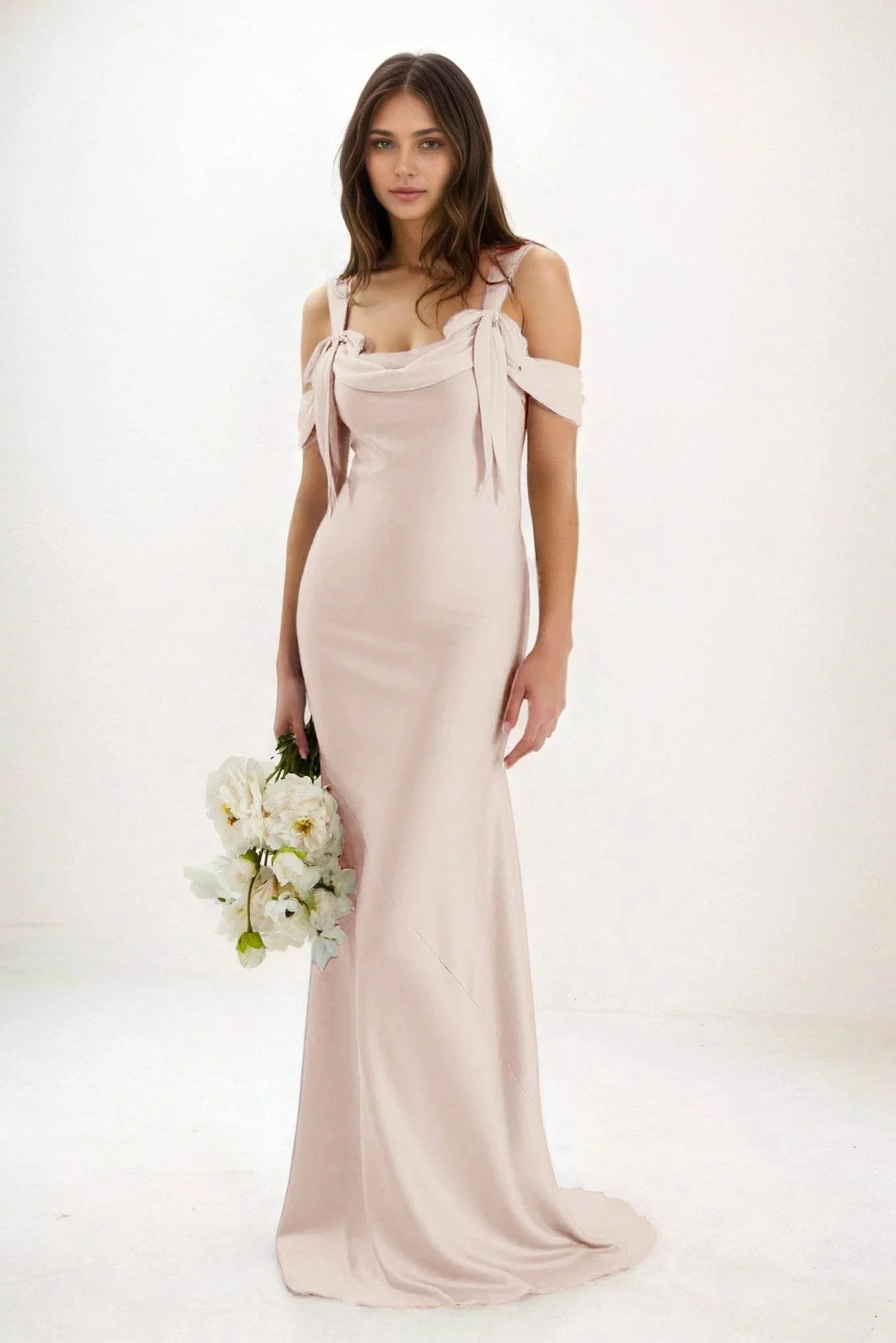 This stunning Sheath-Column Maxi Luxe Satin Pink Bridesmaid Dress features a bateau neckline, off-the-shoulder sleeves, and a flattering natural waist.