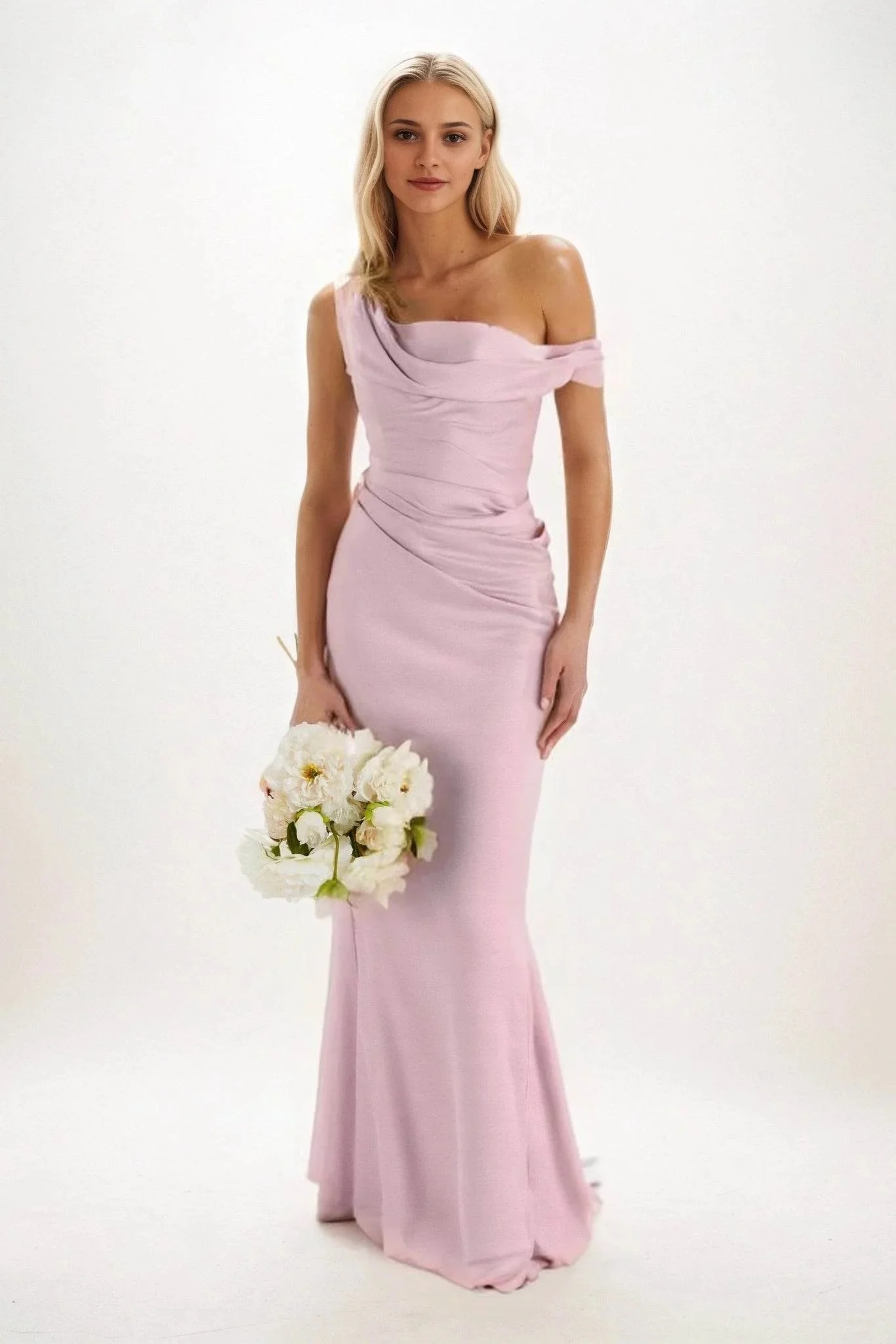 This sophisticated sheath-column maxi luxe satin light blue bridesmaid dress features off-the-shoulder sleeves and flattering ruched detailing.