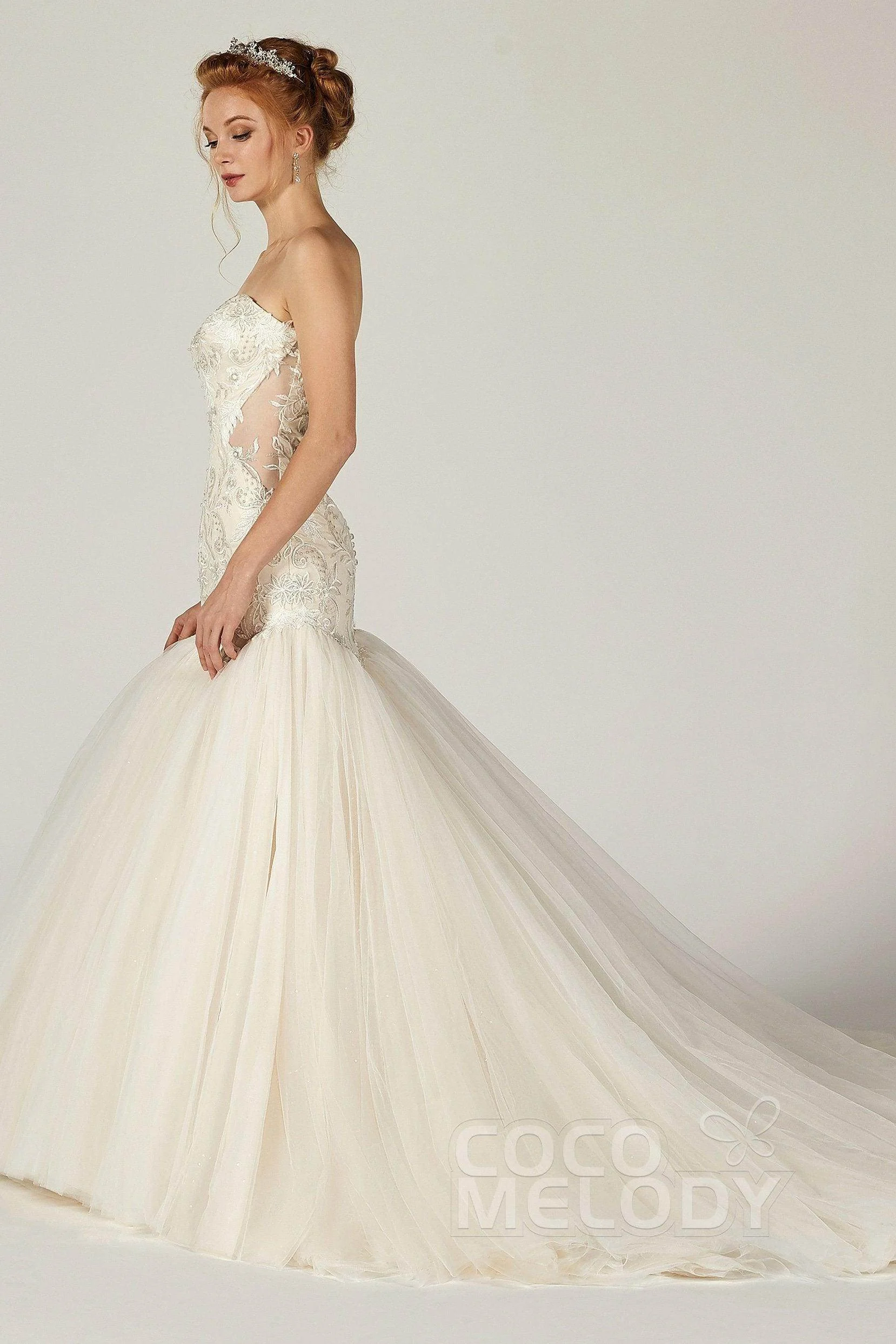Cocomelody Trumpet Chapel Train Tulle Satin Wedding Dress