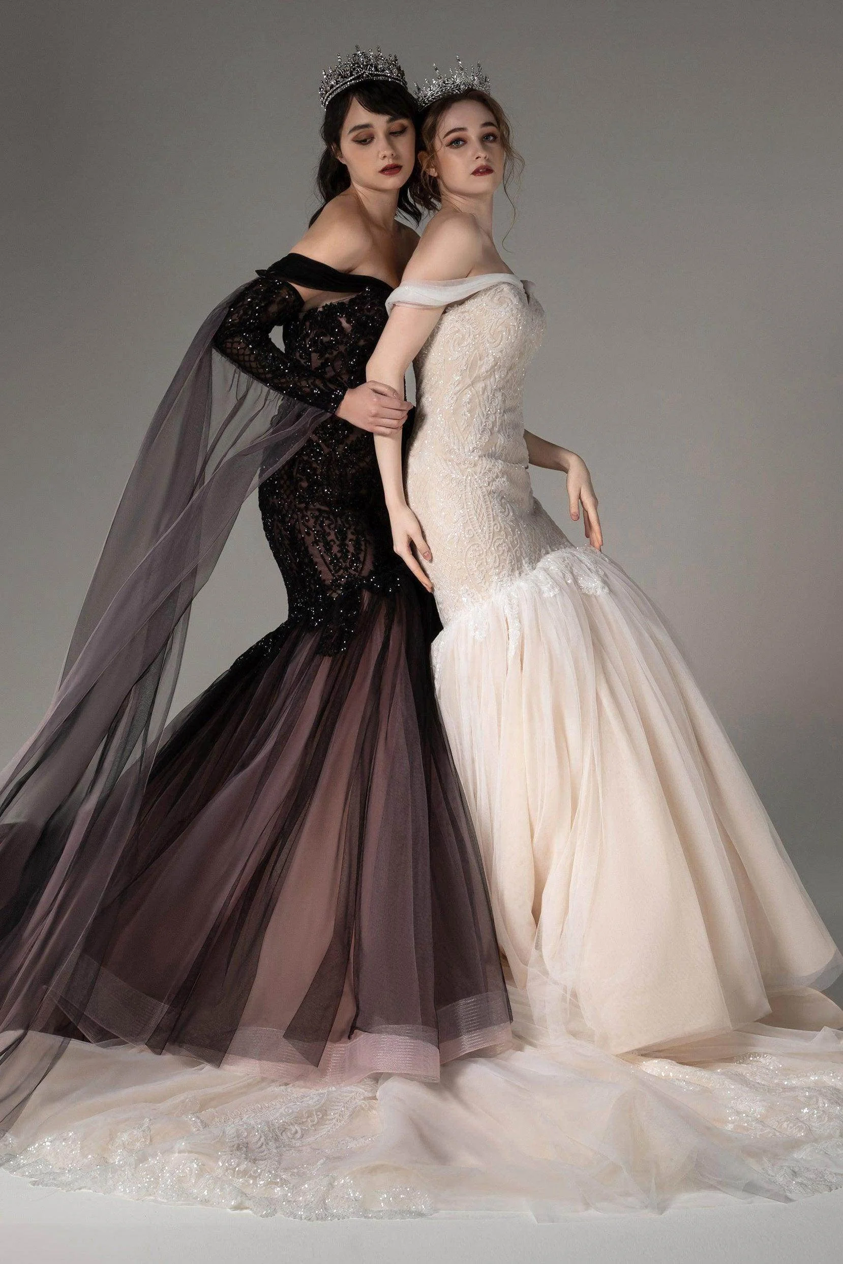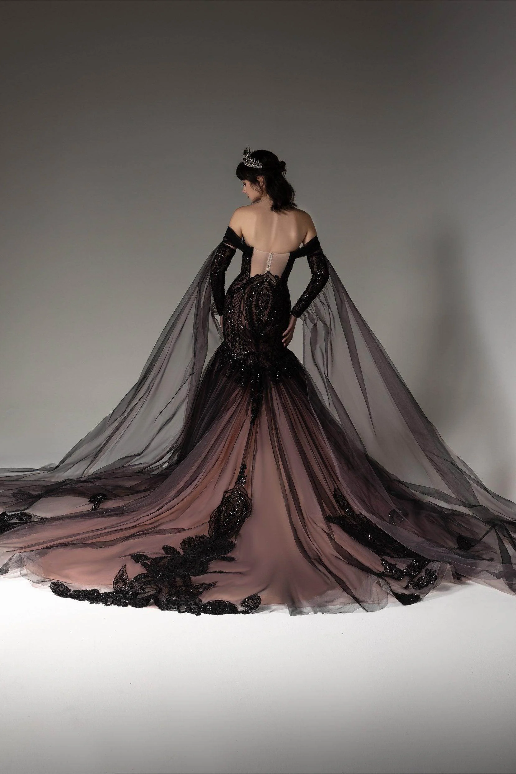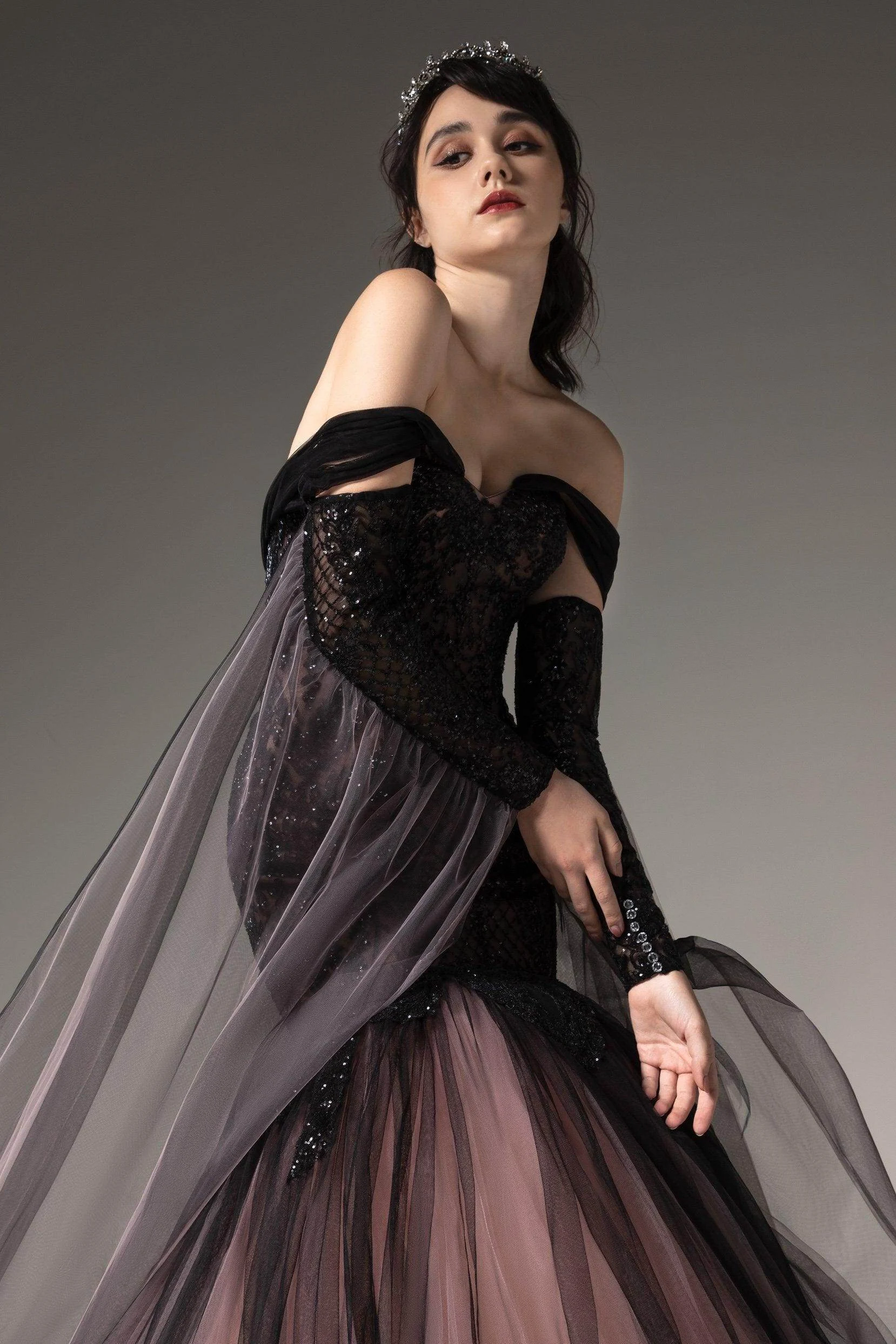 Introducing a bold Black/Dusty Rose wedding gown with an avant-garde off-shoulder design. Adorned with sparkling sequined lace, it exudes edgy glamour. The detachable sleeves offer versatility, while the tulle trumpet-mermaid silhouette adds drama. Embrace a modern Gothic aesthetic with this statement ensemble.