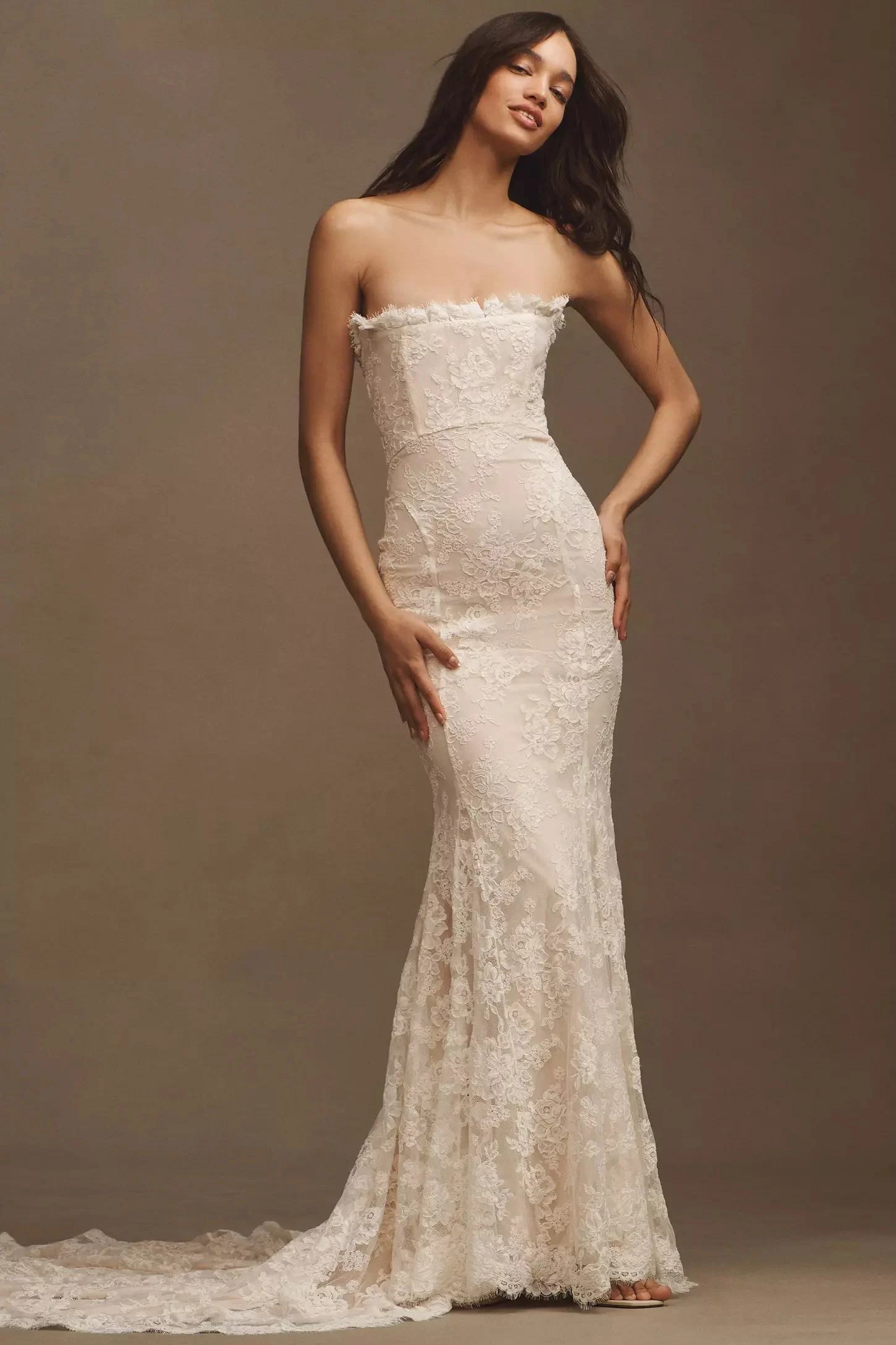 Crafted from classic lace embued with bohemian touches, the Sequoia Wedding Gown by Daughters of Simone boasts a lace-trimmed neckline, removable long sleeves, and a mermaid silhouette that flares at the knee.