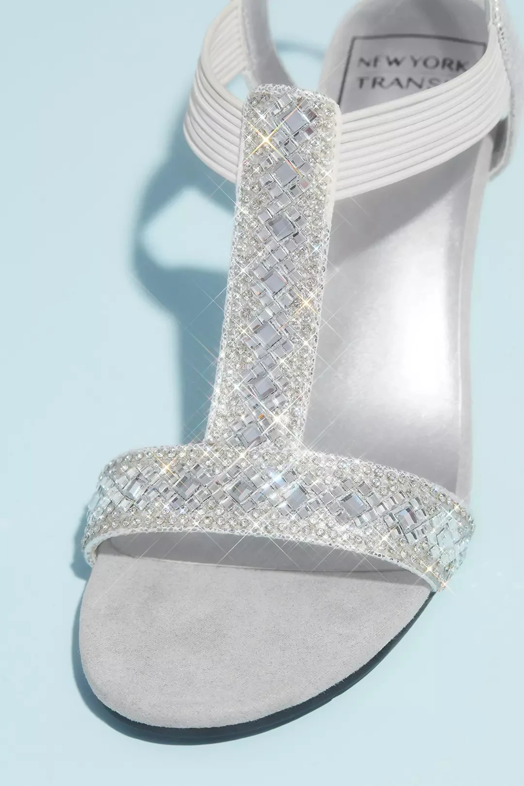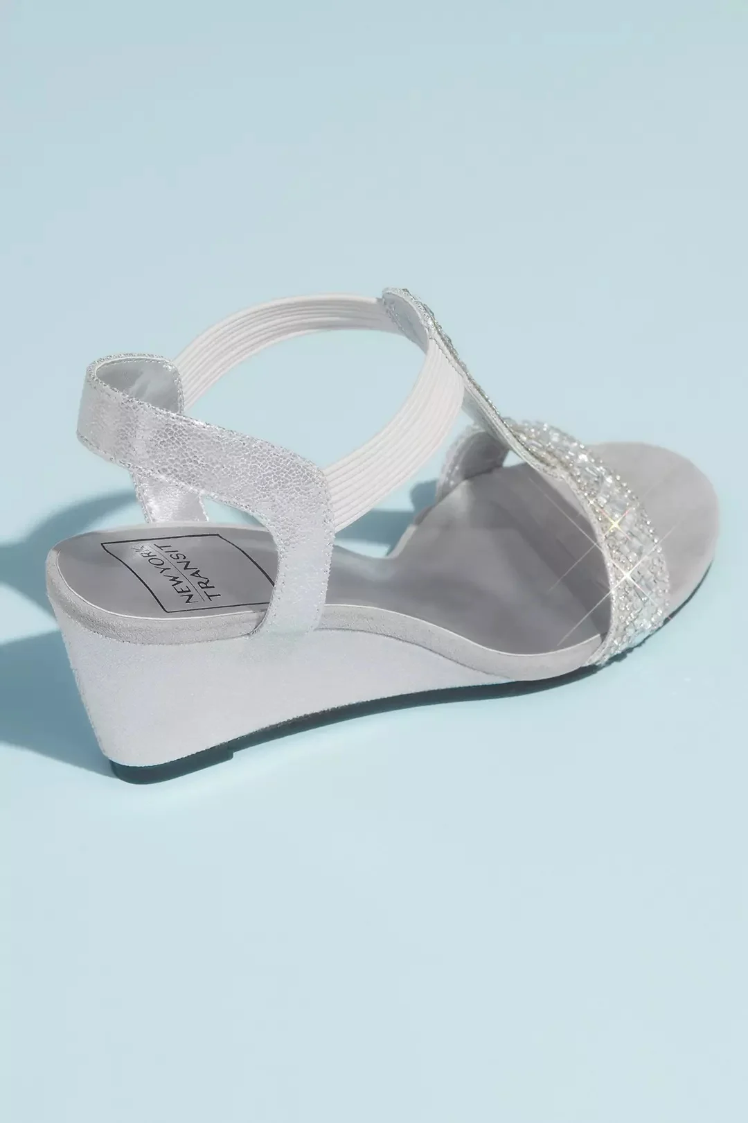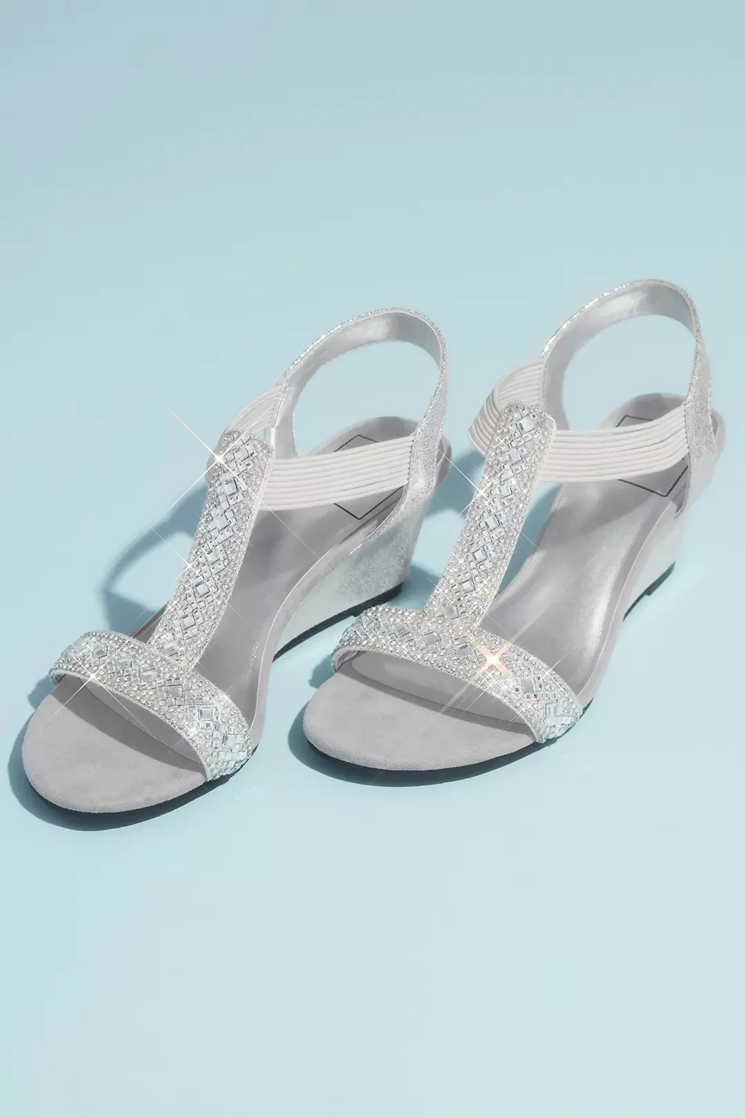 David’s Bridal Crystal Pull On Metallic T-Strap Wedge Sandals