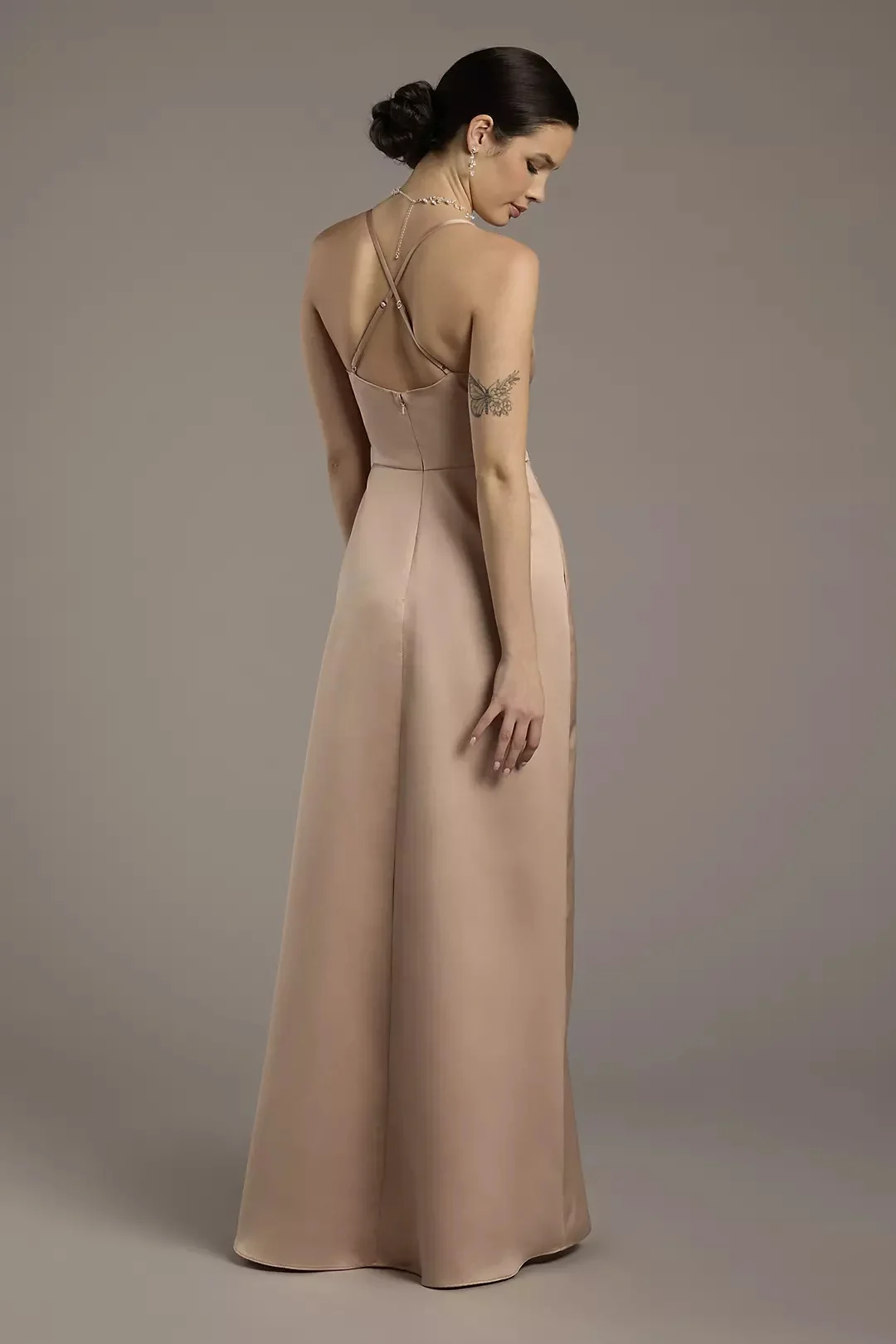 Make a grand entrance in this satin ball gown, featuring a timeless empire waist and a full, flowing skirt. The luxurious sheen and classic silhouette exude elegance for bridesmaids or formal occasions.