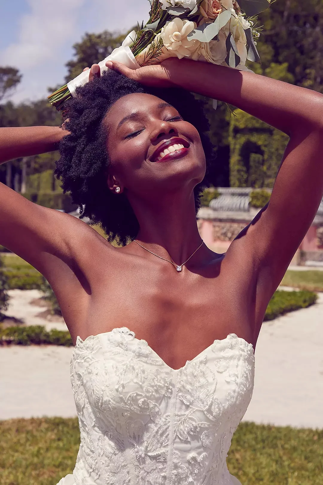 If you’re dreaming of princess vibes, a ball gown wedding dress is a must! It takes nearly 15 hours, four fabrics, 16 yards of organza, and two types of lace appliques to create the full-tiered silhouette straight out of a fairy tale. A strapless sweetheart neckline and dramatic chapel train complete the magical aesthetic, no fairy godmother needed!