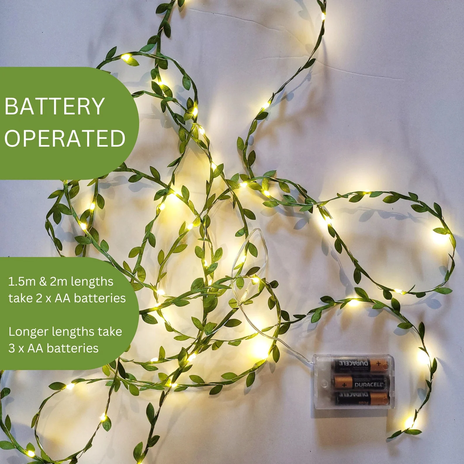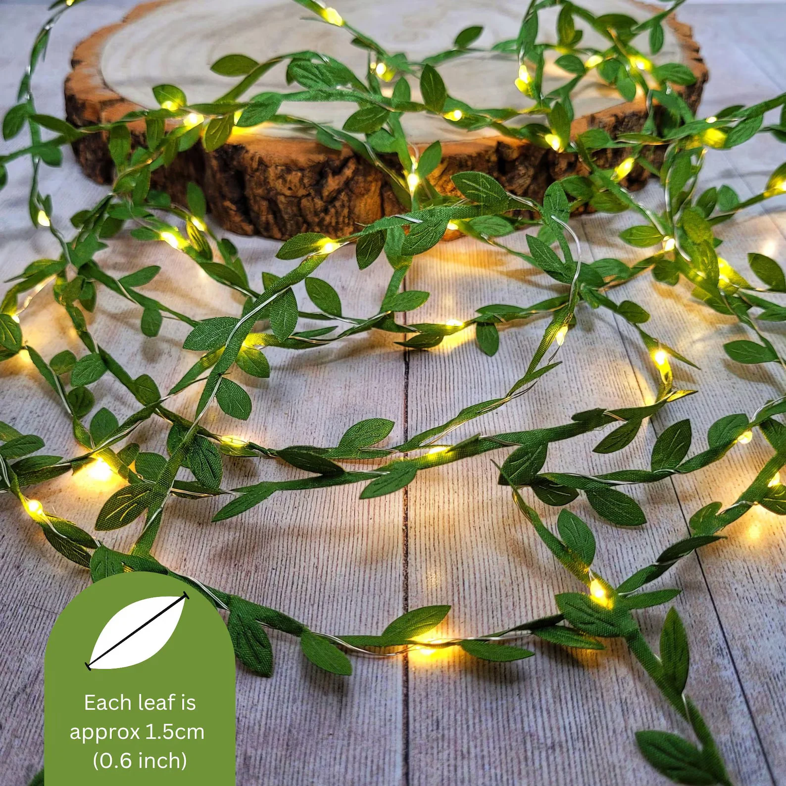 This green leaf fairy light garland with warm white mini LEDs is perfect for your home, wedding or event decor.