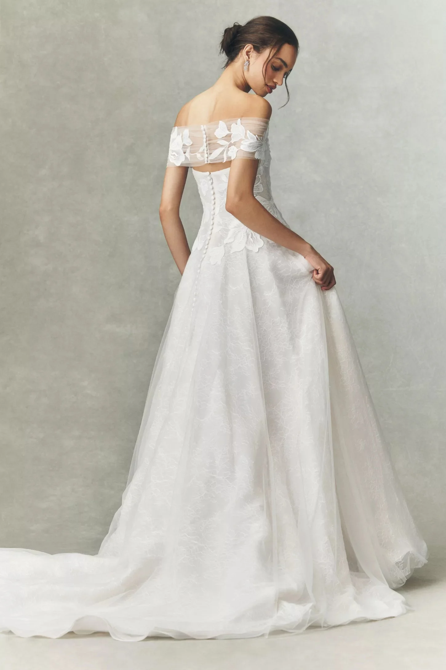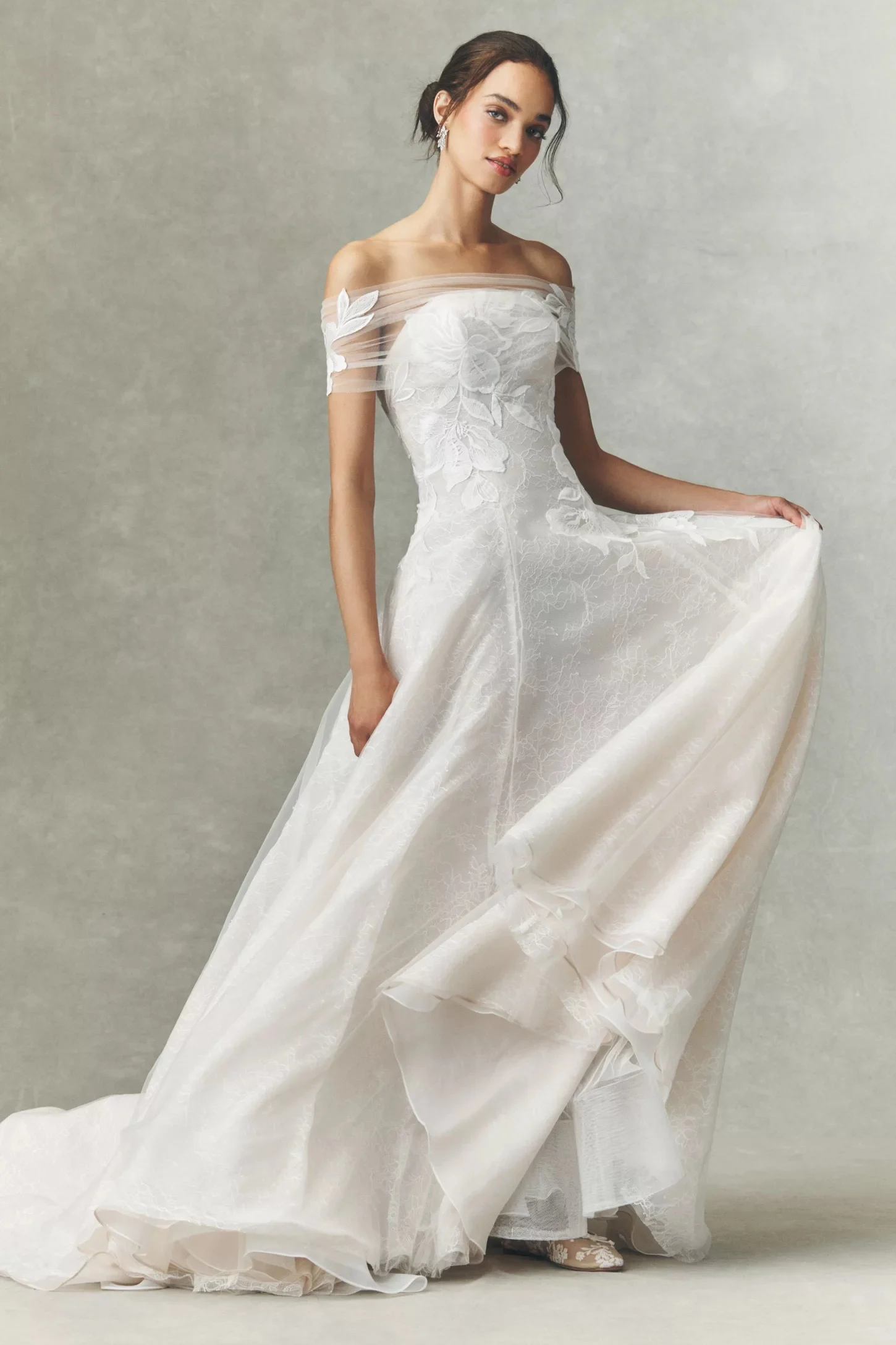 Crafted from delicate chantilly lace, the Carmella Wedding Gown vows to wow with a chic off-shoulder neckline and a structured bodice accented by romantic floral appliqués. A flowing skirt, complete with a sweeping train, completes the look.
