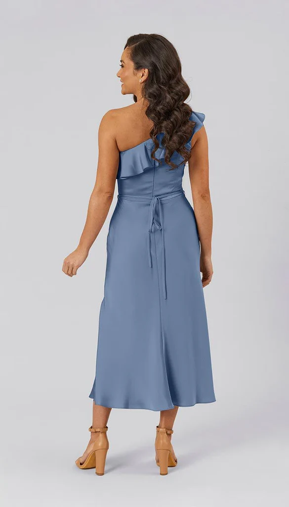 This Freya short satin bridesmaid dress with a ruffle on one shoulder is a perfect flirty, fun, and feminine option for bridesmaids.