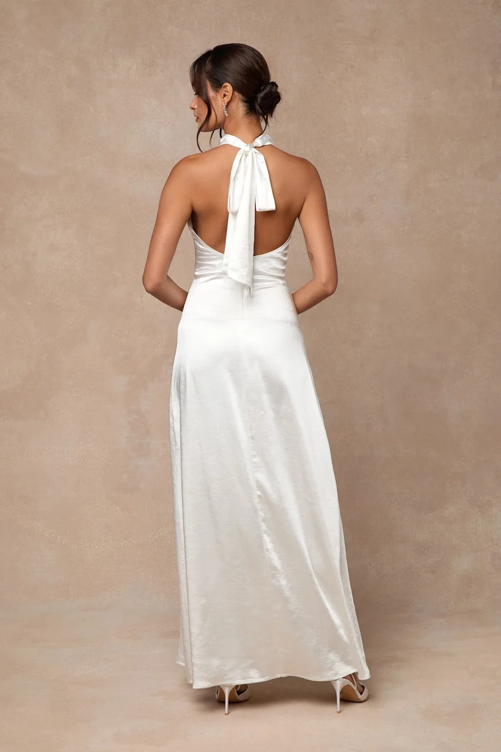 Love lasts forever when blessed with this stunning bridal dress, crafted from sleek woven satin that gracefully skims your figure. The tying halter neckline features elegant draping while supporting a darted, fitted bodice with a playful open back for a flirty touch.