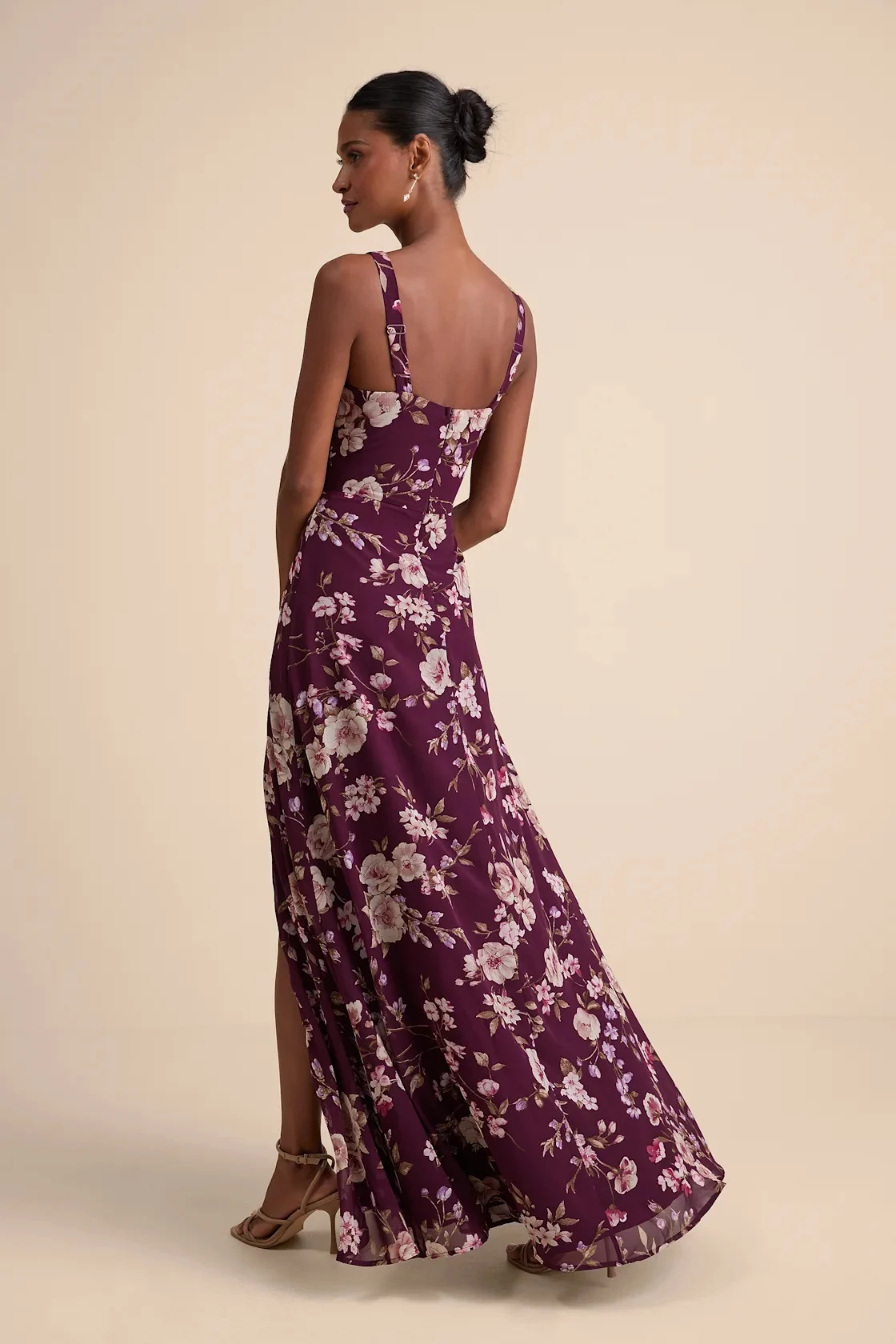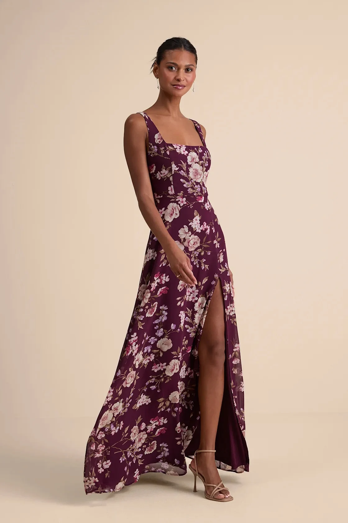 Lightweight woven chiffon, with a whimsical floral print throughout, shapes this graceful dress, featuring tank straps and a flattering darted bodice. High, fitted waist sits above a chic and airy skirt that falls to a maxi hem with a stunning side slit. Hidden zipper/clasp at back.