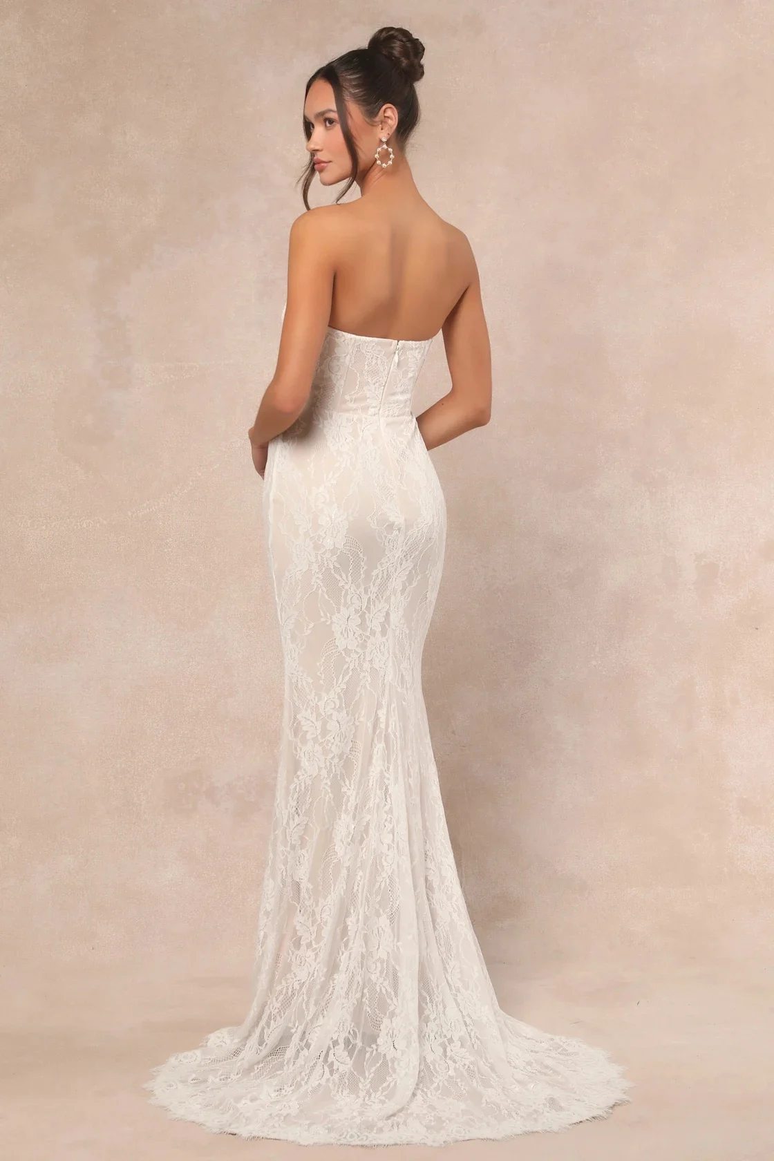 This exquisite gown boasts a romantic lace overlay (atop a beige knit liner) that shapes a strapless, bustier-inspired bodice with supportive boning, padded underwire cups, and chic floral embroidery at the center.
