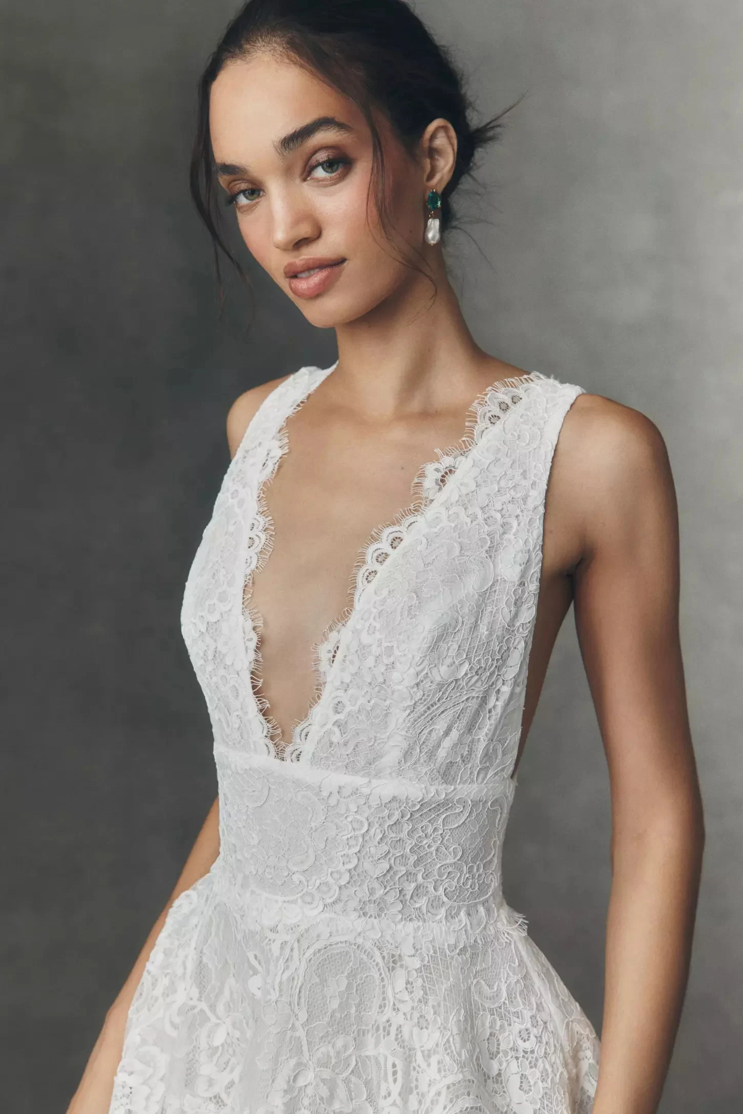 The Vayda Wedding Gown is an A-line design featuring a plunged V-neckline neckline. A banded waist creates structure, while the full skirt adds volume and movement.